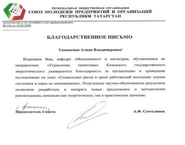 Нсуе Елума Хесус Панчо Бакале Телегова Анастасия Сергеевна Фаррахова Алия Маратовна Фатахов Булат Маратович Шаймарданова Лейсан Ильфатовна Юсупова Вера Александровна | Участие в исследовании на тему: «Социальные риски в среде работающей молодежи: оценка состояния и меры по минимизации» |