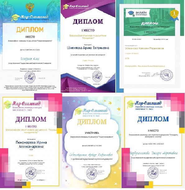 Гатина Эльвина | 4 | Всероссийская олимпиада по дисциплине «Теория менеджмента» (2019г.) | Федеральный уровень, Диплом 1 степени. |
