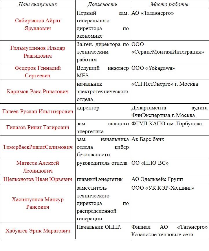 Высшее образование, получаемое нашими выпускниками высоко ценится предприятиями реального сектора экономики - Казаньоргсинтез, Казанский моторостроительное производственное объединение, Завод Элекон, ИНВЭНТ-Электро, Сетевая компания, Ферекс, Ледел, СервисМонтажИнтеграция и т.д.