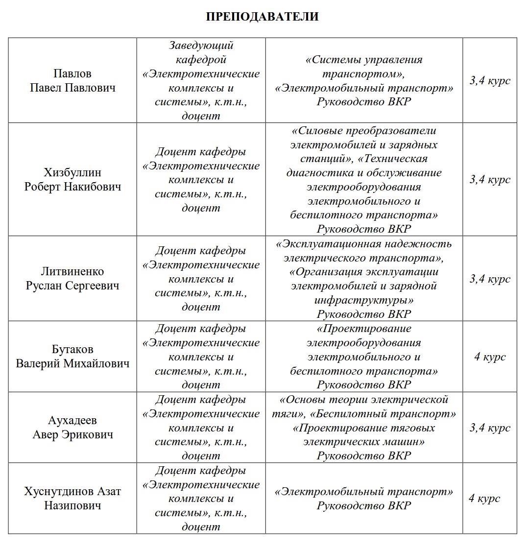 Обучение по направлению «Электромобильный и беспилотный транспорт» предполагает подготовку выпускника кафедры для работы в качестве инженерно-технического персонала, обладающего компетенциями в сфере проектирования, внедрения, изготовления, эксплуатации и ремонта электрического, беспилотный и подключенный транспорта, систем энергообеспечения транспортной системы, электрического и телекоммуникационного оборудования и сетей транспортной инфраструктуры, бортовых источников и накопителей энергии транспортных средств, силовых преобразователей и тягового электрического привода, электрического и беспилотного подвижной состав городского общественного транспорта, беспилотного индивидуального транспортного средства, гибридных автомобилей, электромобилей и зарядных станций.