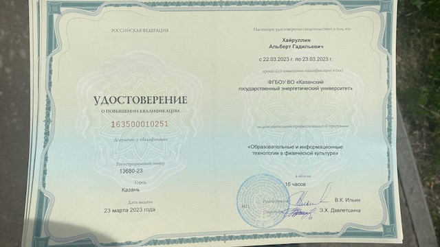 " Занятия физической культурой и спортом при миопии" Хайруллин А Г ,Имангулов Р.Ш. статья на второй Всероссийской научно-практической конференции с международным участием " Физическая культура , спорт,туризм:наука, образование, информационные технологии" Казань 20-21 марта 2024 года. стр. 117-120 |