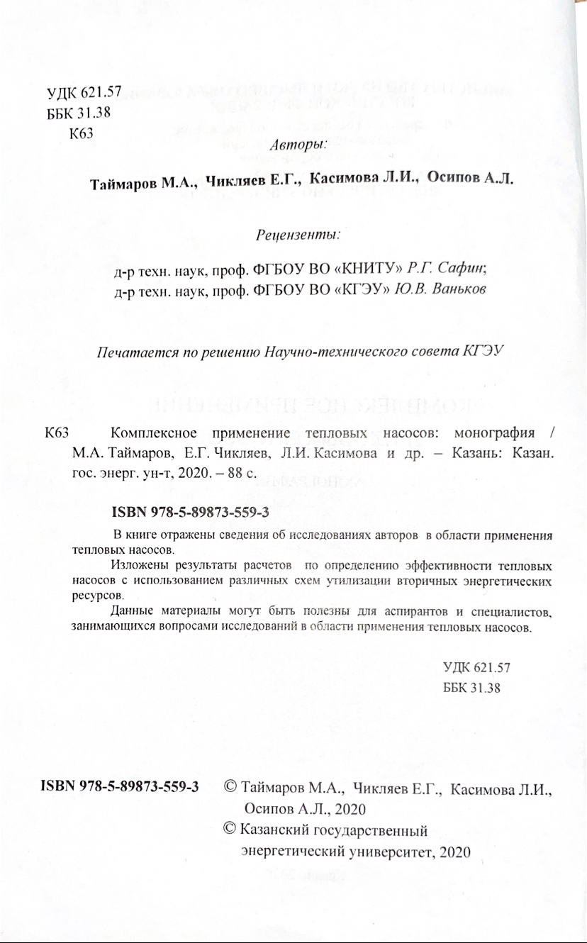 КОМПЛЕКСНОЕ ПРИМЕНЕНИЕ ТЕПЛОВЫХ НАСОСОВ: монография / М.А. Таймаров, Е.Г. Чикляев, Л.И. Касимова и др. - Казань: Казан. гос . энерг. ун-т, 2020. - 88 с. Монография 2020