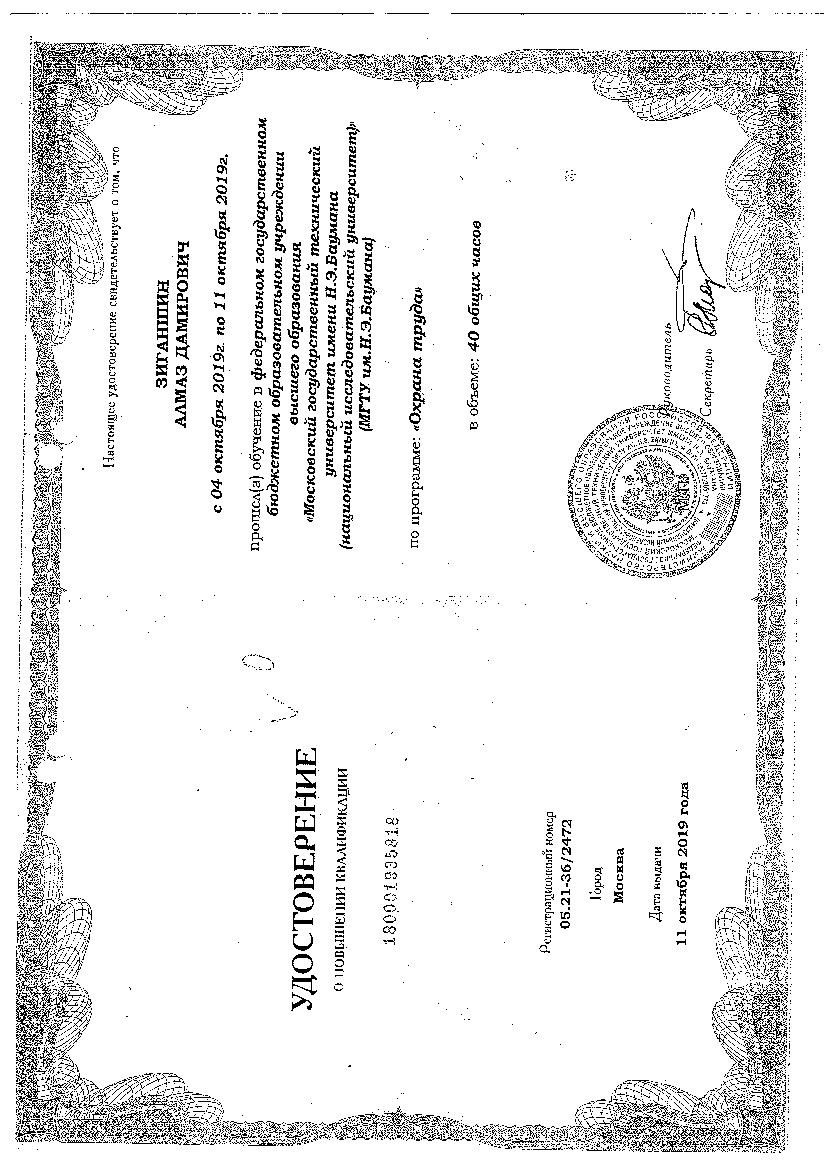 ФГБОУ ВО "Московский государственный технический университет им. Баумана" Удостоверение 05.21-36/2210 13.11.2018 16