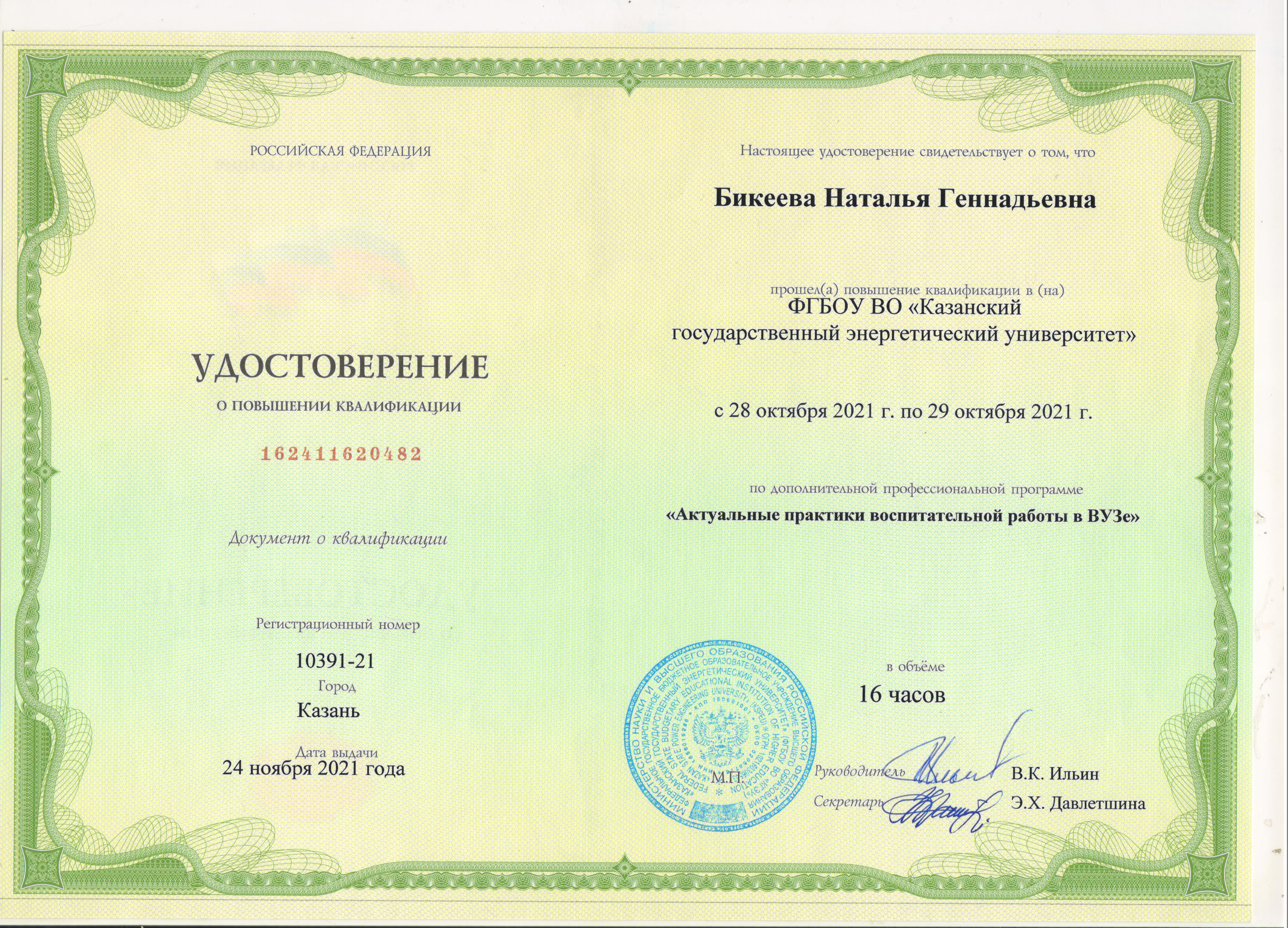 ФГБОУ ВО "КГЭУ" Дополнительная профессиональная программа "Актуальные практики воспитательной работы в ВУЗе" 162411620482 24.11.2021 16