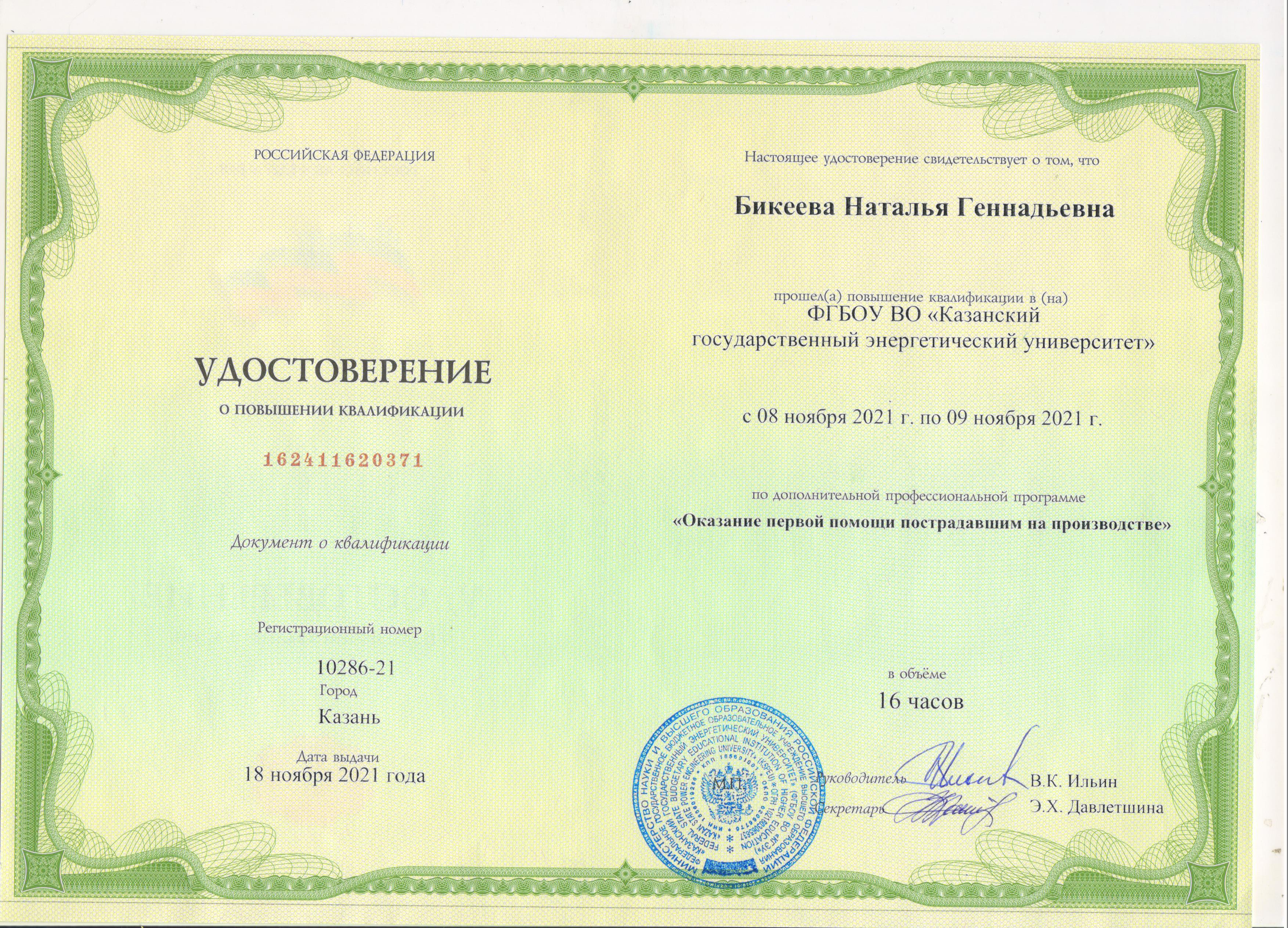 ФГБОУ ВО "КГЭУ" Дополнительная профессиональная программа "Оказание первой помощи пострадавшим на производстве" 162411620371 18.11.2021 16