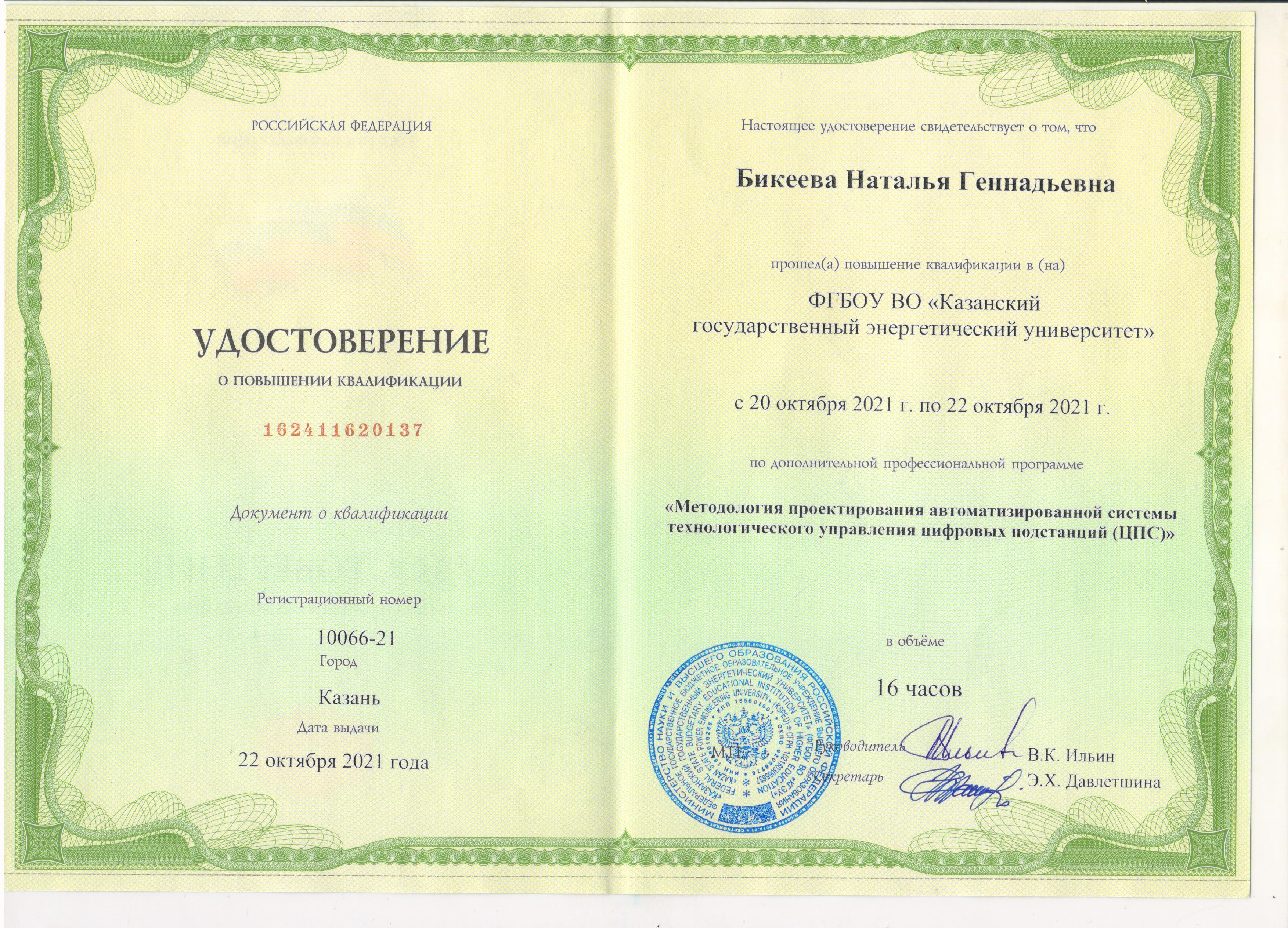 ФГБОУ ВО "КГЭУ" Дополнительная профессиональная программа "Методология проектирования автоматизированной системы технологического управления цифровых подстанций (ЦПС)" 162411620137 22.10.2021 16