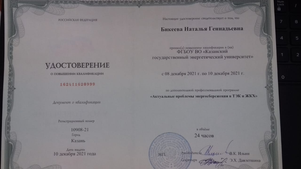 ФГБОУ ВО "КГЭУ" Дополнительная профессиональная программа "Актуальные проблемы энергосбережения в ТЭК и ЖКХ" 162411620999 10.12.2021 24