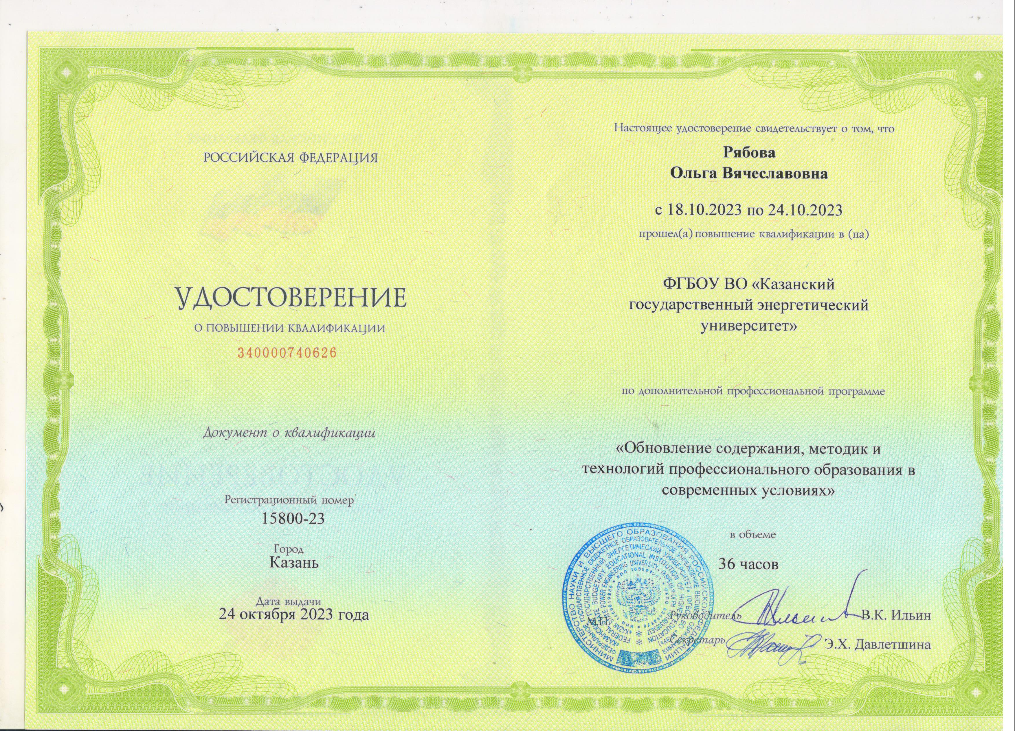 ФГБОУ ВО "КГЭУ" Обновление содержания, методик и технологий профессионального образования в современных условиях 340000740626 24.10.2023 36