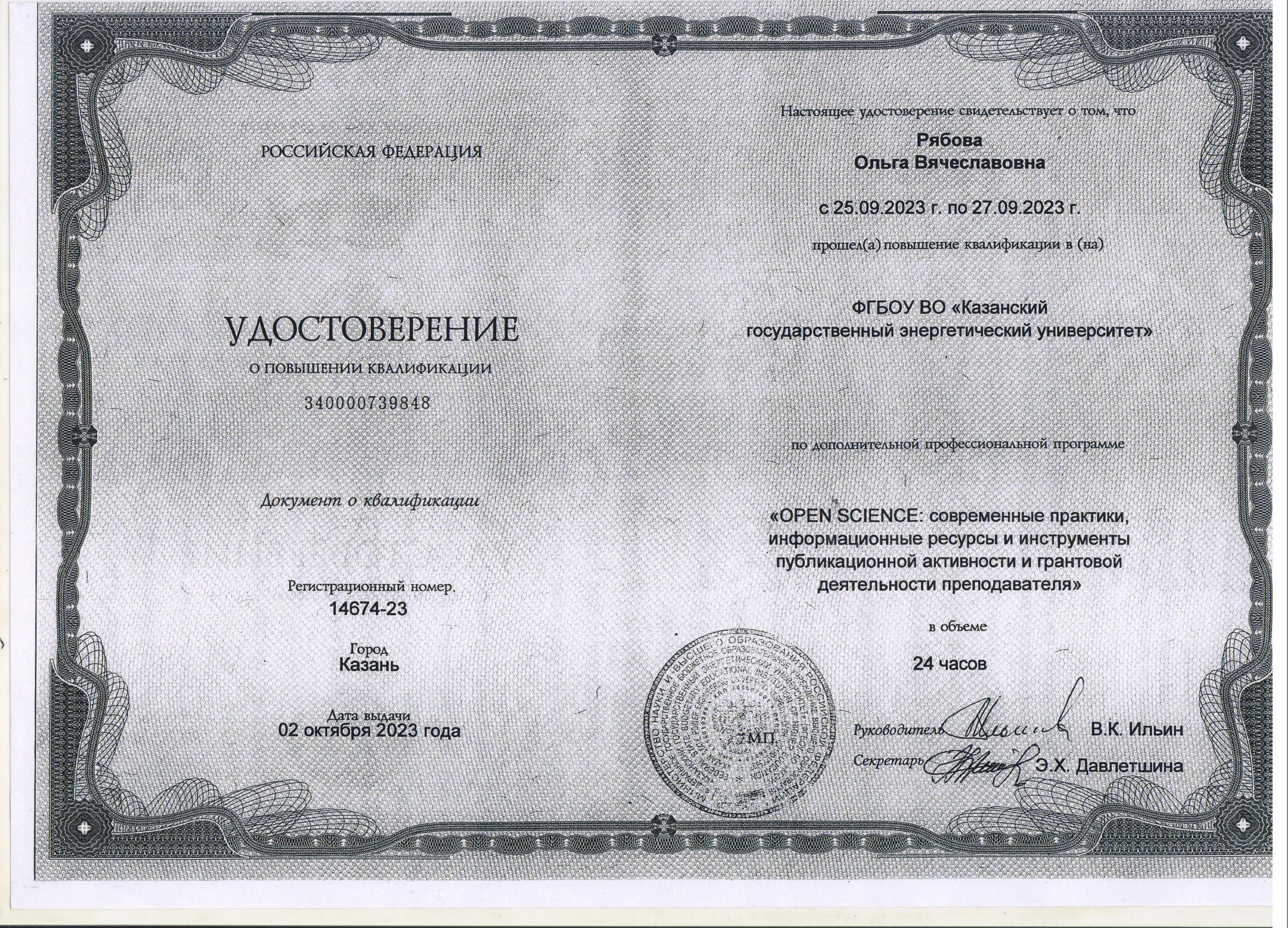 ФГБОУ ВО "КГЭУ" OPEN SCIENCE:современные практики, информацйионные ресурсы и инструменты публикационной активности и грантовой деятельности преподавателя 340000739848 02.10.2023 24