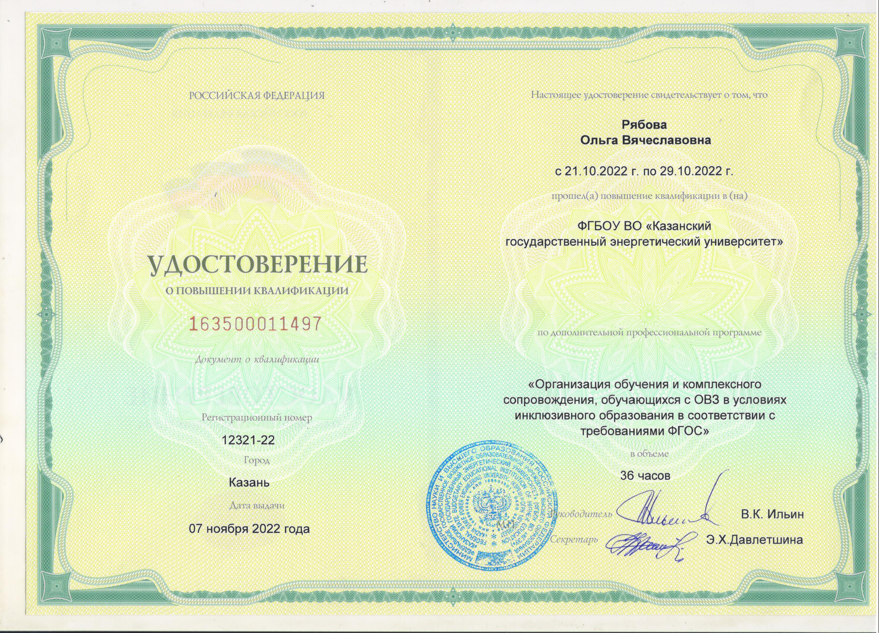 ФГБОУ ВО "КГЭУ" Организация обучения и комплексного сопровождения обучающихся с ОВЗ в условиях инклюзивного образования в соответствии с требованиями ФГОС 163500011497 07.11.2022 36