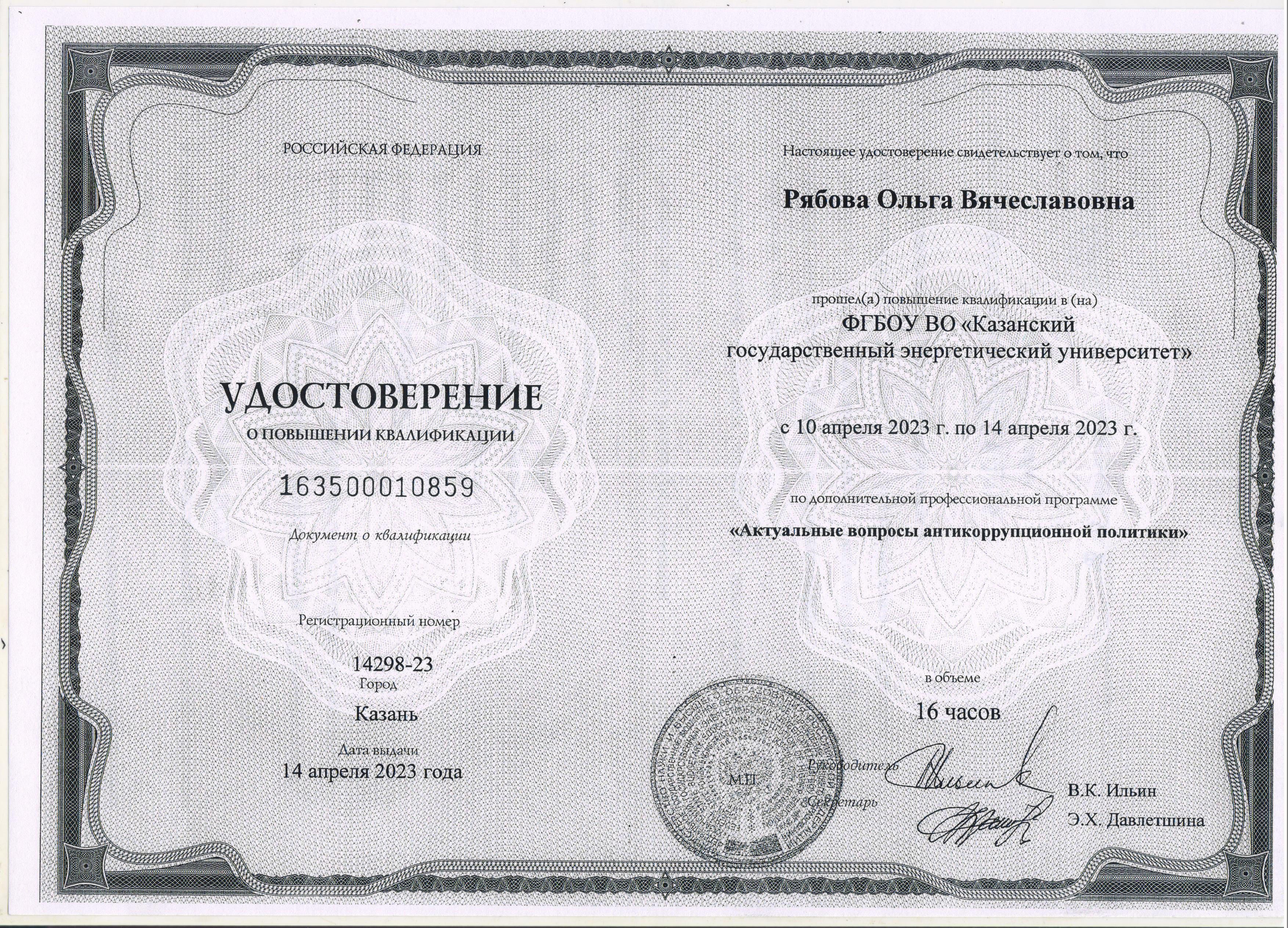 ФГБОУ ВО "КГЭУ" Актуальные вопросы антикоррупционной политики 163500010859 14.04.2023 16