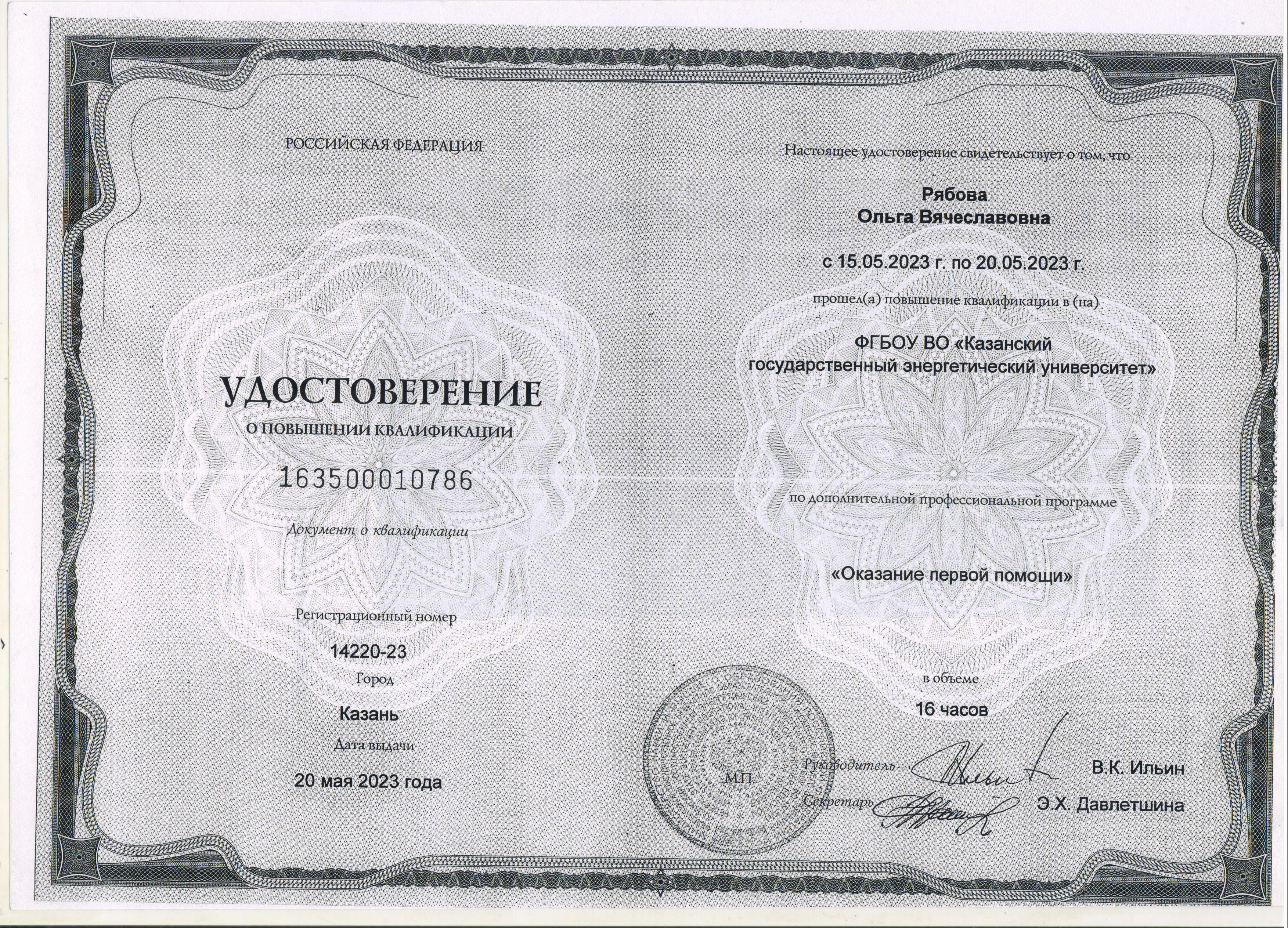 ФГБОУ ВО "КГЭУ" Оказание первой помощи 163500010786 20.05.2023 16
