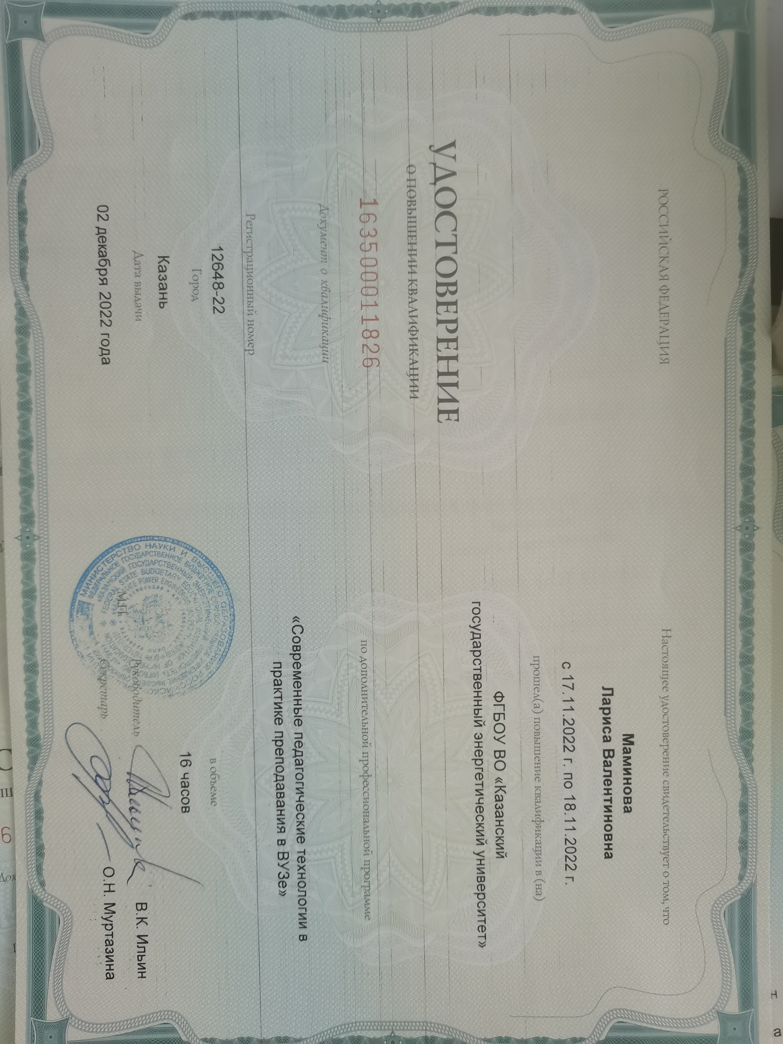 ФГБОУ ВО "Казанский государственный энергетический университет" Современные педагогические технологии и практика преподавания в вузе 12648-22 02.12.2022 16