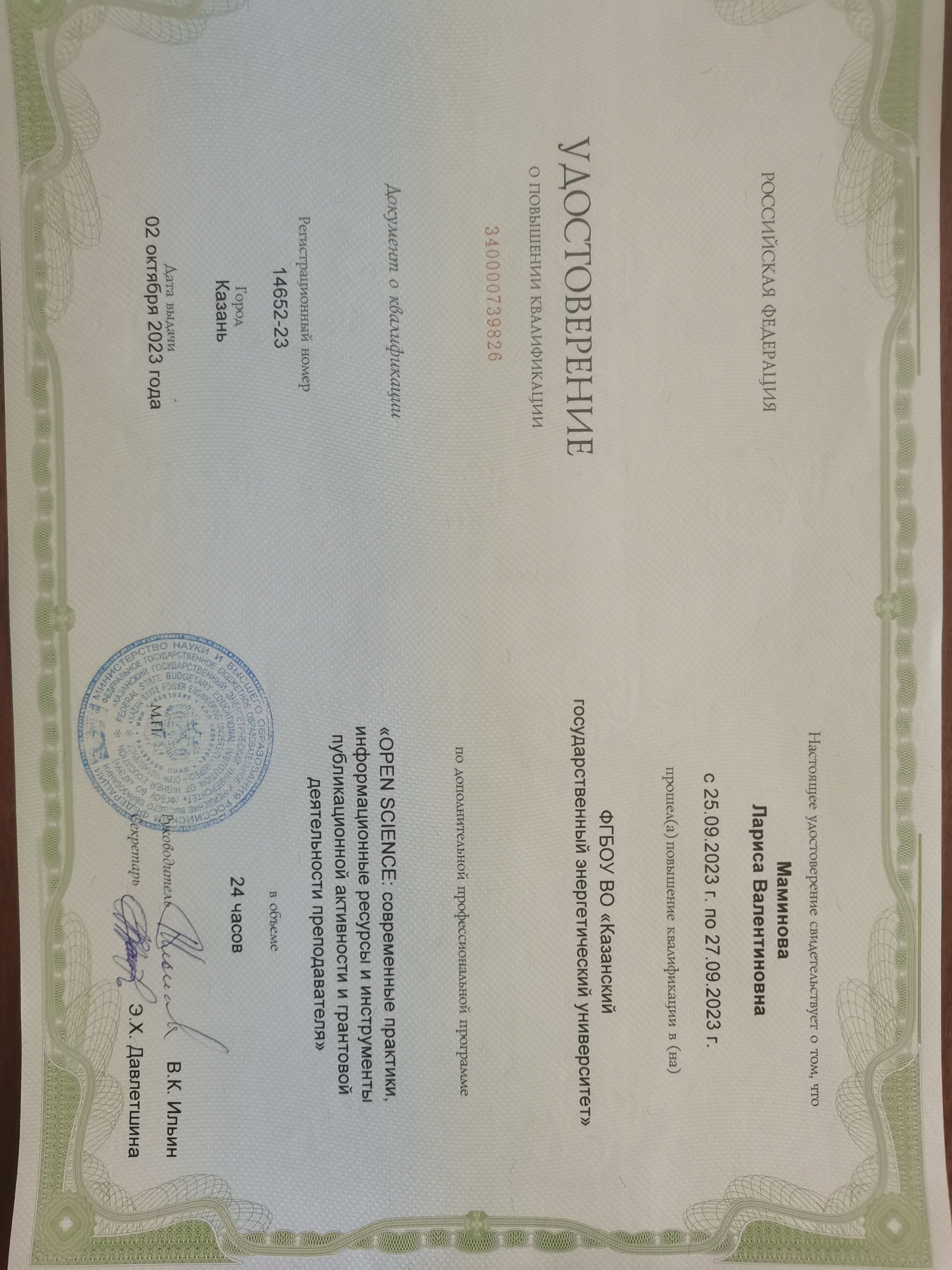 ФГБОУ ВО "Казанский государственный энергетический университет" OPEN SCIENCE: СОВРЕМЕННЫЕ ПРАКТИКИ, ИНОФОРМАЦИОННЫЕ РЕСУРСЫ И ИНСТРУМЕНТЫ ПУБЛИКАЦИОННОЙ АКТИВНОСТИ И ГРАНТОВОЙ ДЕЯТЕЛЬНОСТИ ПРЕПОДАВАТЕЛЯ 14652-23 02.10.2023 24