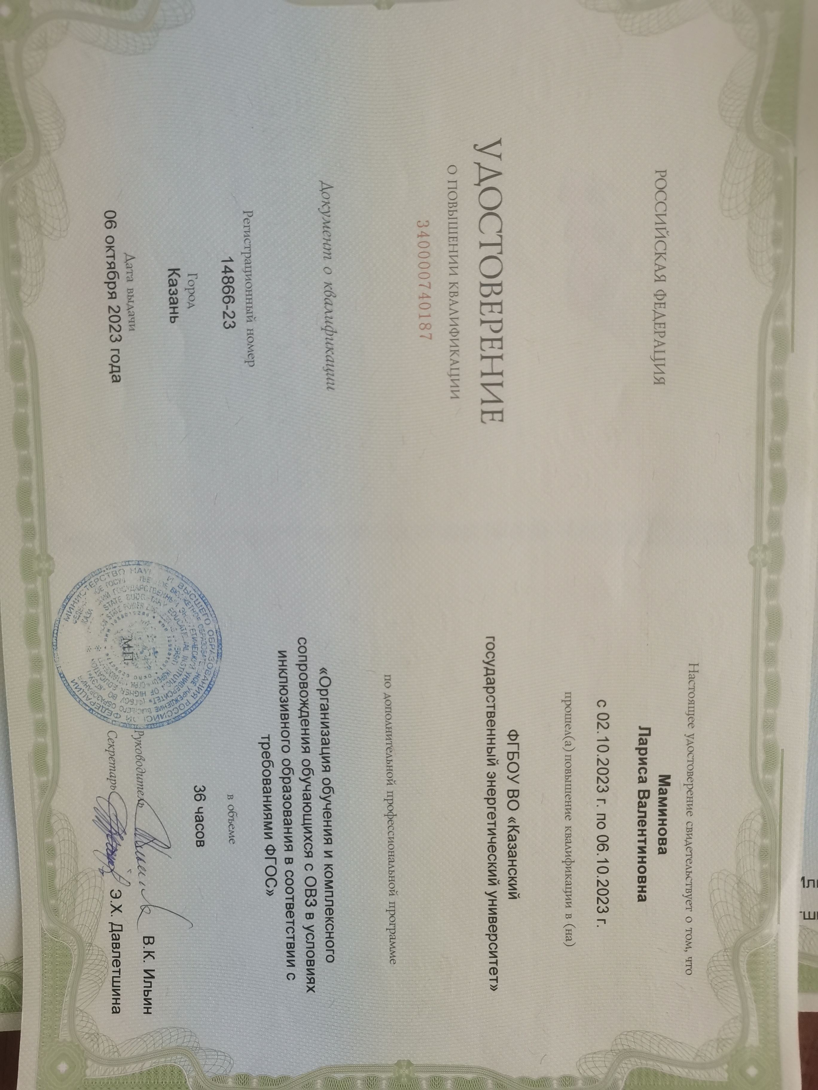 ФГБОУ ВО "Казанский государственный энергетический университет" Организация обучения и комплексного сопровождения обучающихся с ОВЗ в условиях инклюзивного образования в соответствии с требованиями ФГОС 14866-23 06.10.2023 36