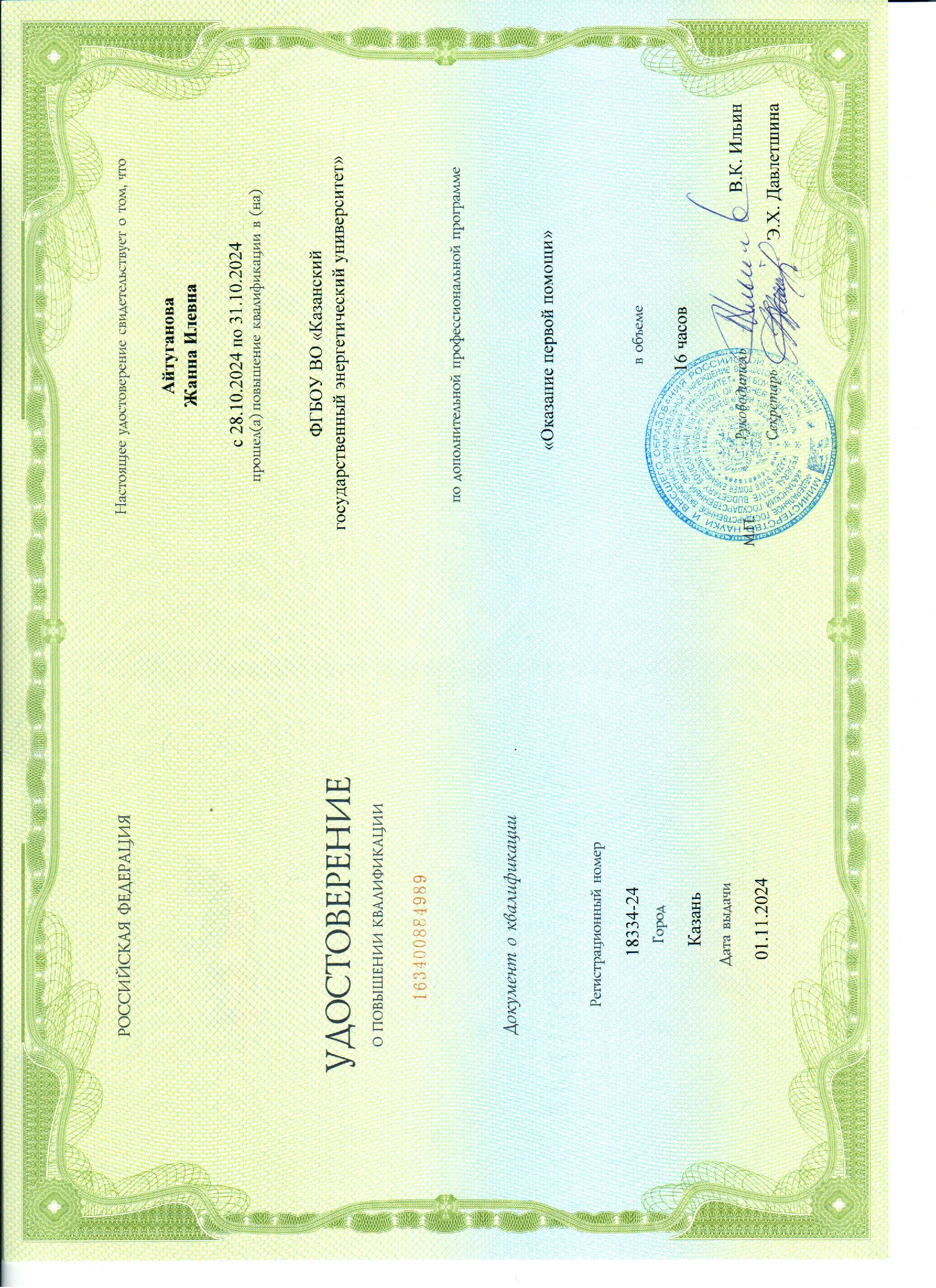 КГЭУ Оказание первой помощи 16 ч. 163400884989 01.11.2024