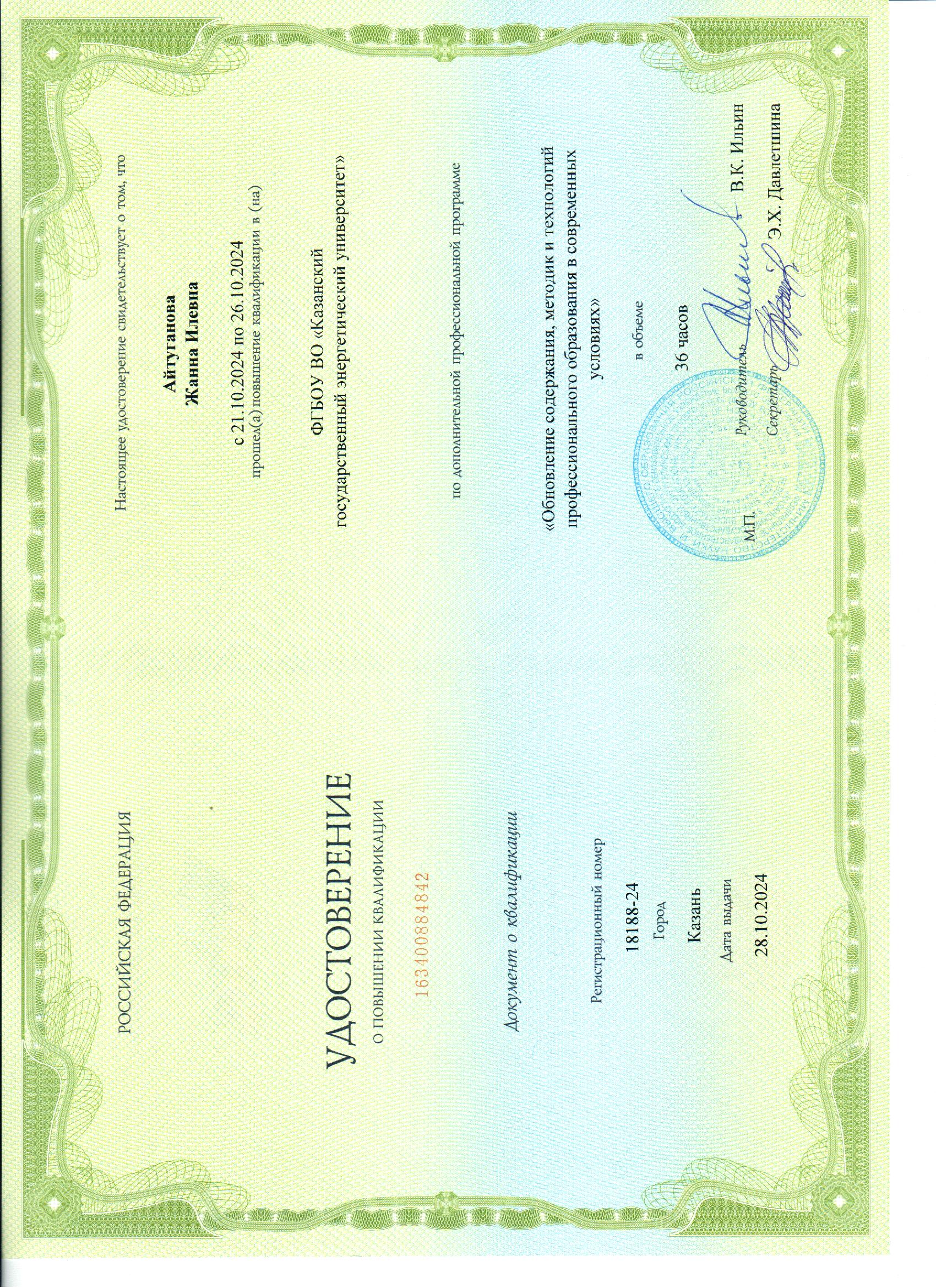 КГЭУ Обновление содержания, методик и технологий профессионального образования в современных условиях 36 ч. 163400884842 28.10.2024