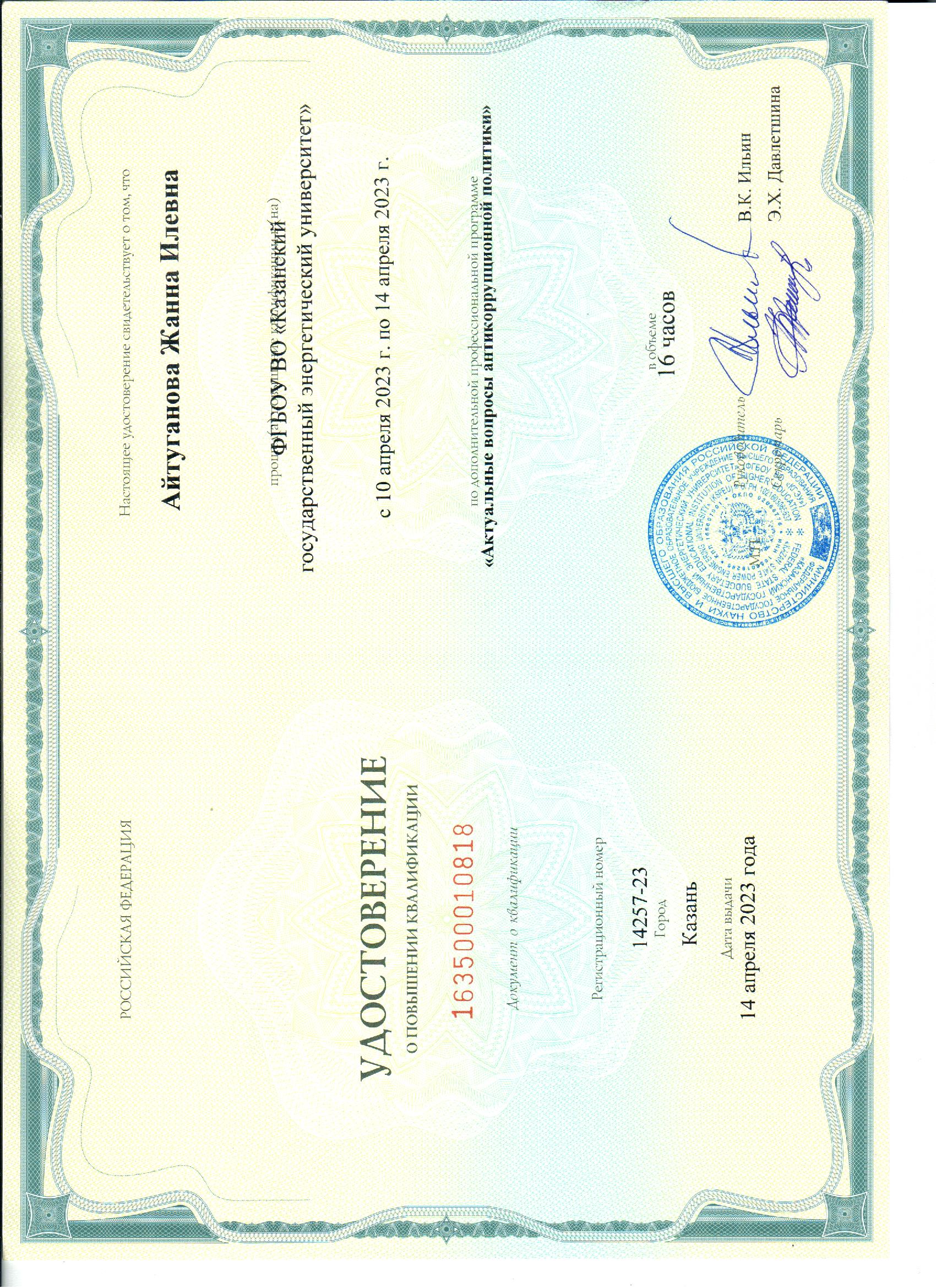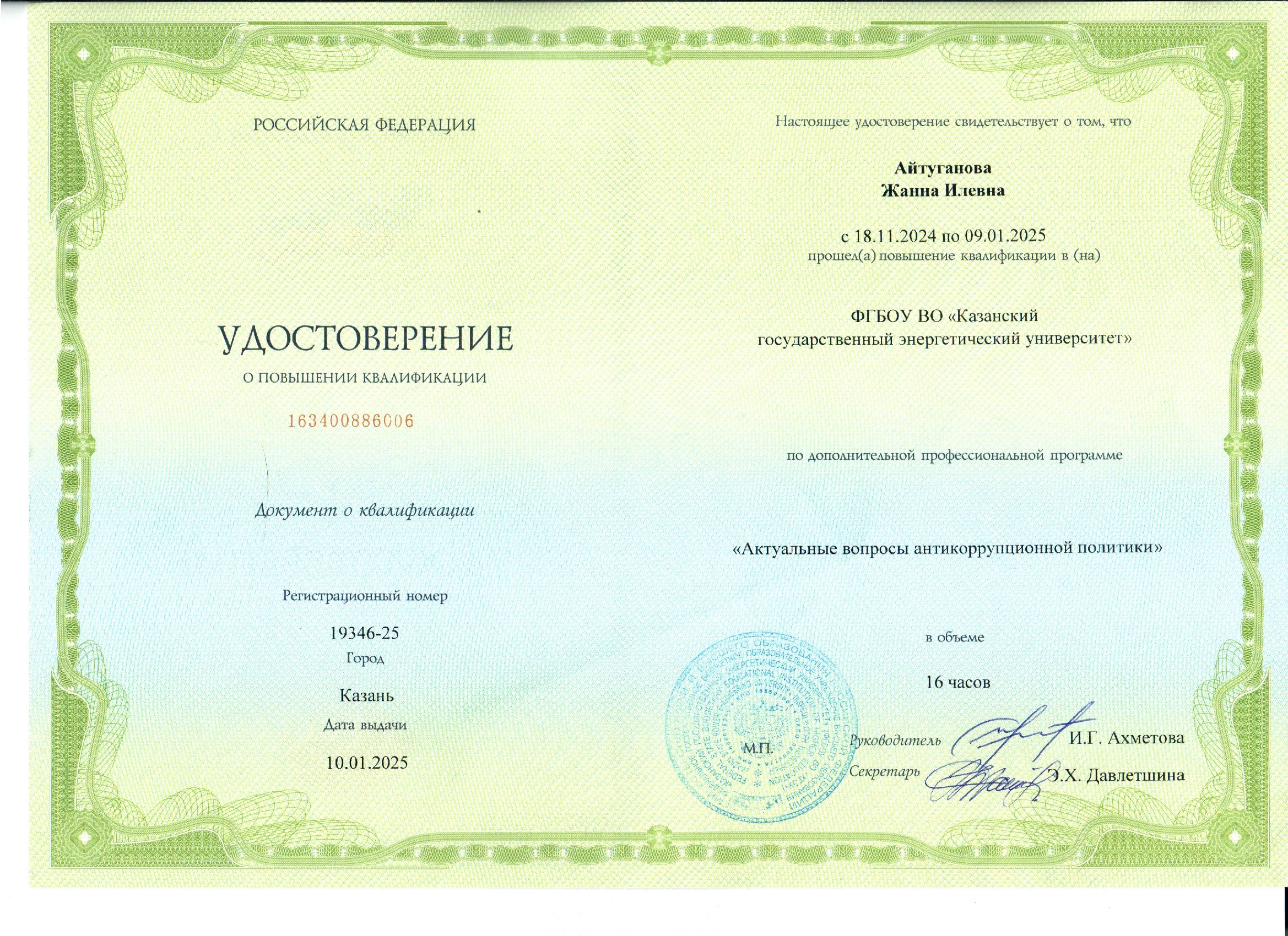 ФГБОУ ВО КГЭУ Повышение квалификации по программе "Актуальные вопросы антикоррупционной политики " с 18.11.2024- 9.01.2025 г. 163400886006 10.01.2025
