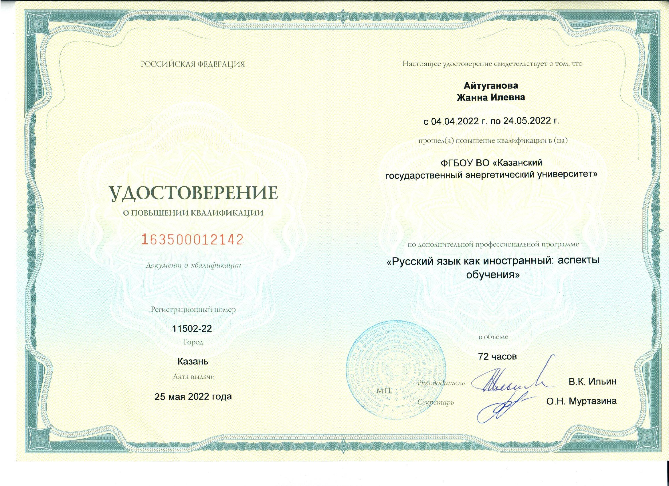 КГЭУ Руссий язык как иностранный: аспекты обучения" 4.04 2022 - 24.05.2022 163500012142 25.05.2022 72