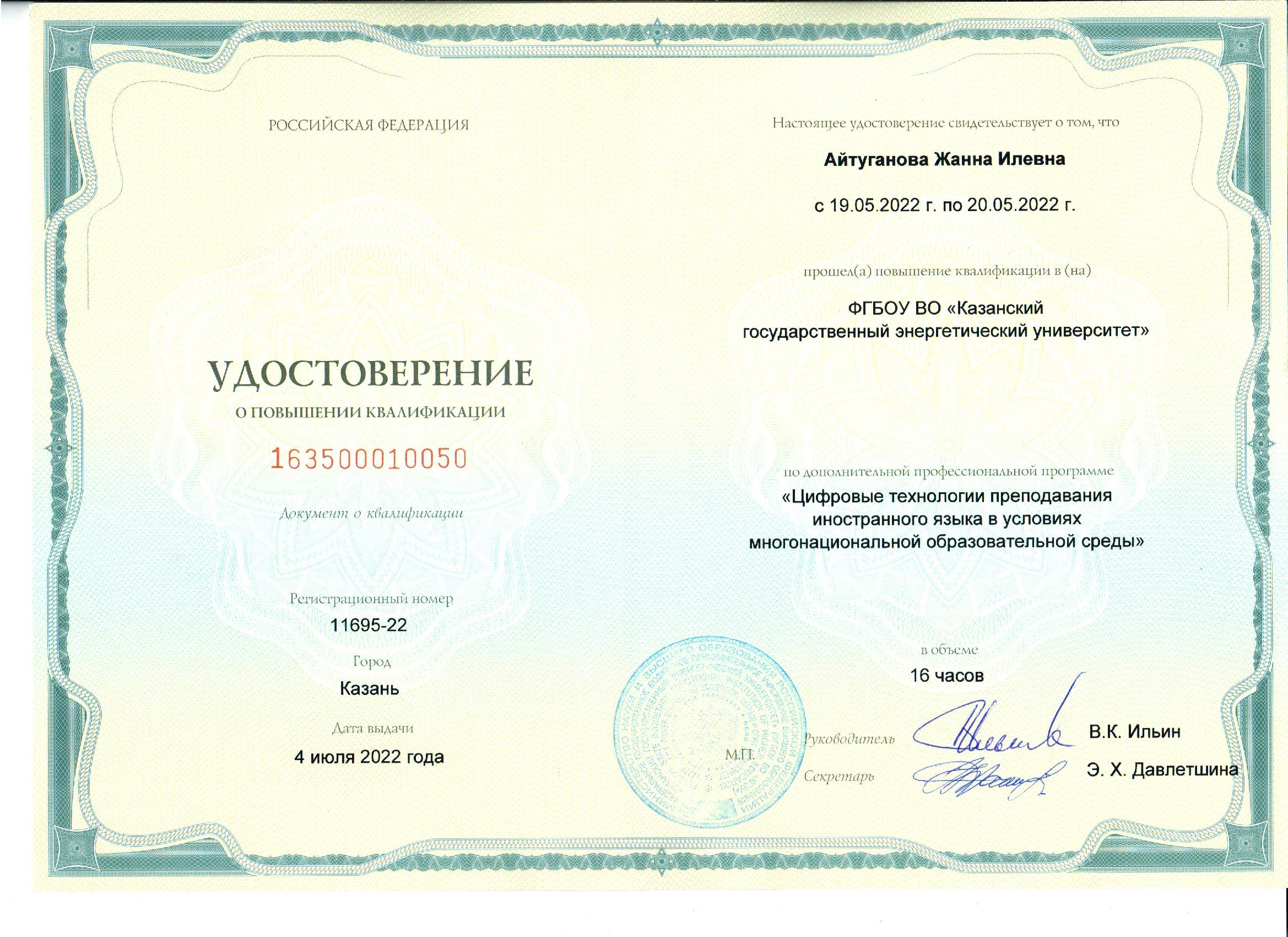 ФГБОУ КГЭУ " Цифровые технологии преподавания иностранного языка в условиях многонациональной образовательной среды" 163500010050 04.07.2022