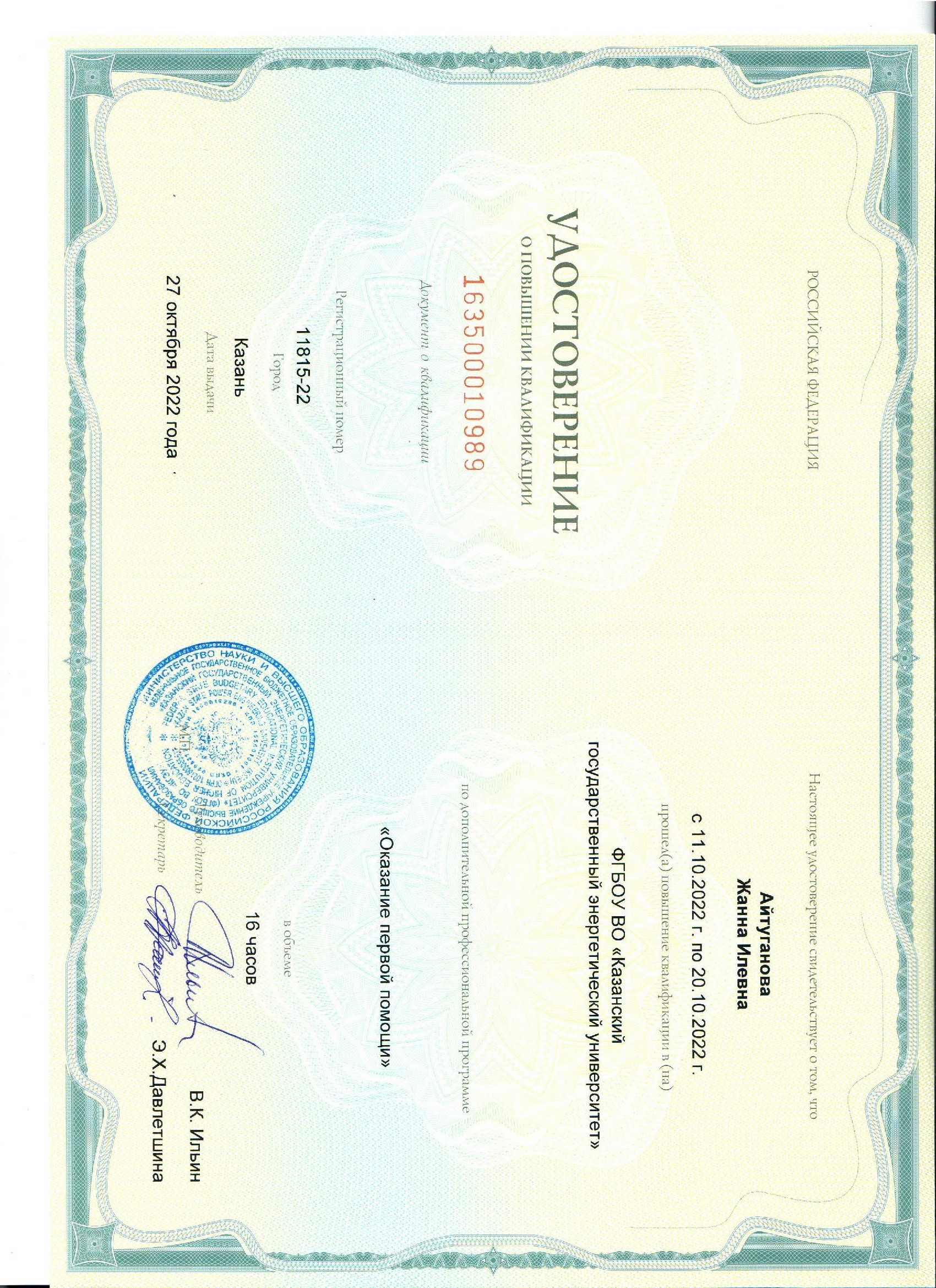 ФГБОУ ВО КГЭУ Оказание первой помощи 163500010989 27.10.2022 16
