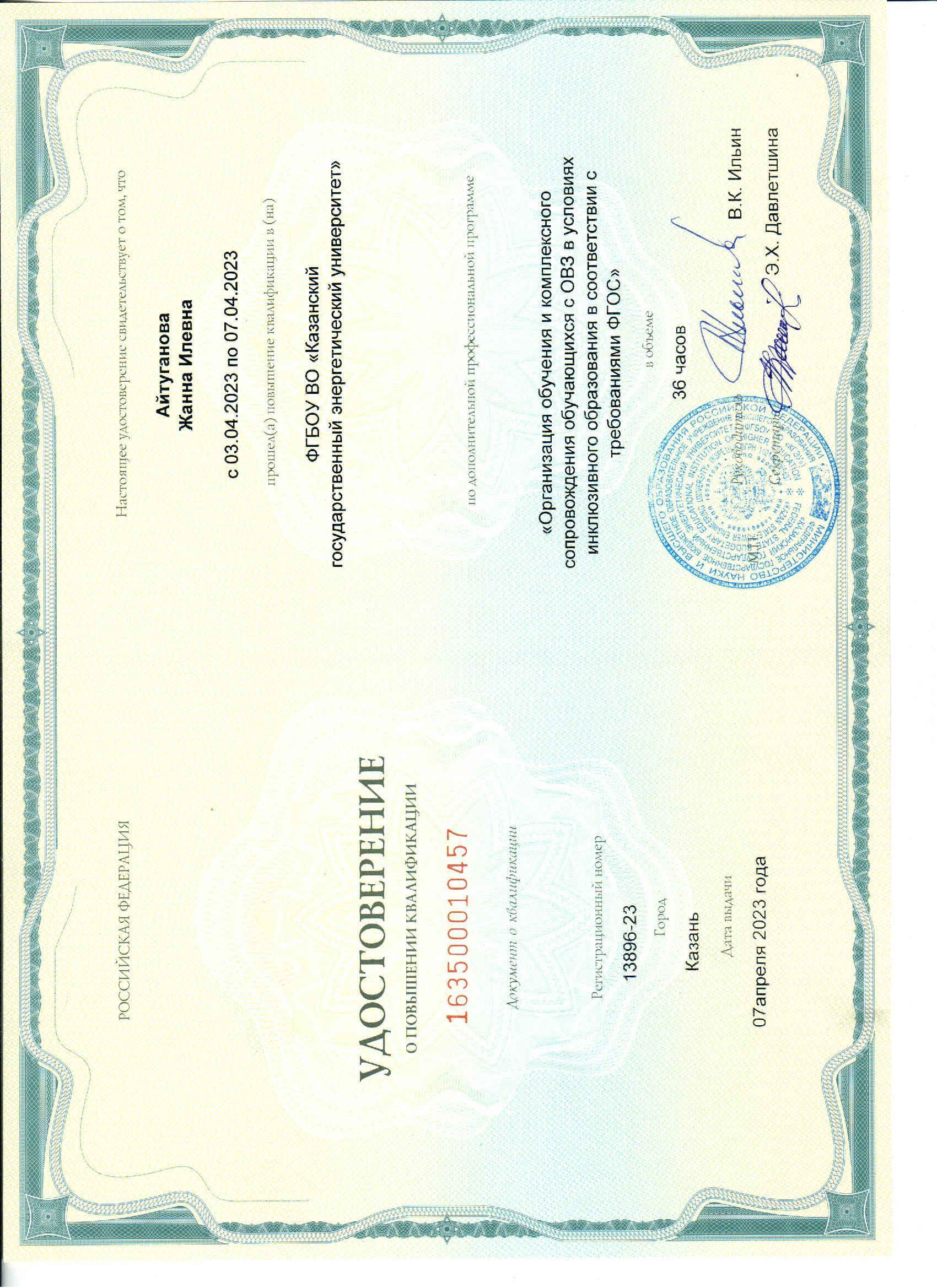 ФГБОУ ВО КГЭУ Организация обучения и комплексного сопровождения обучающихся с ОВЗ в условиях инклюзивного образования в соответствии с требованиями ФГОС 163500010457 07.04.2023 36