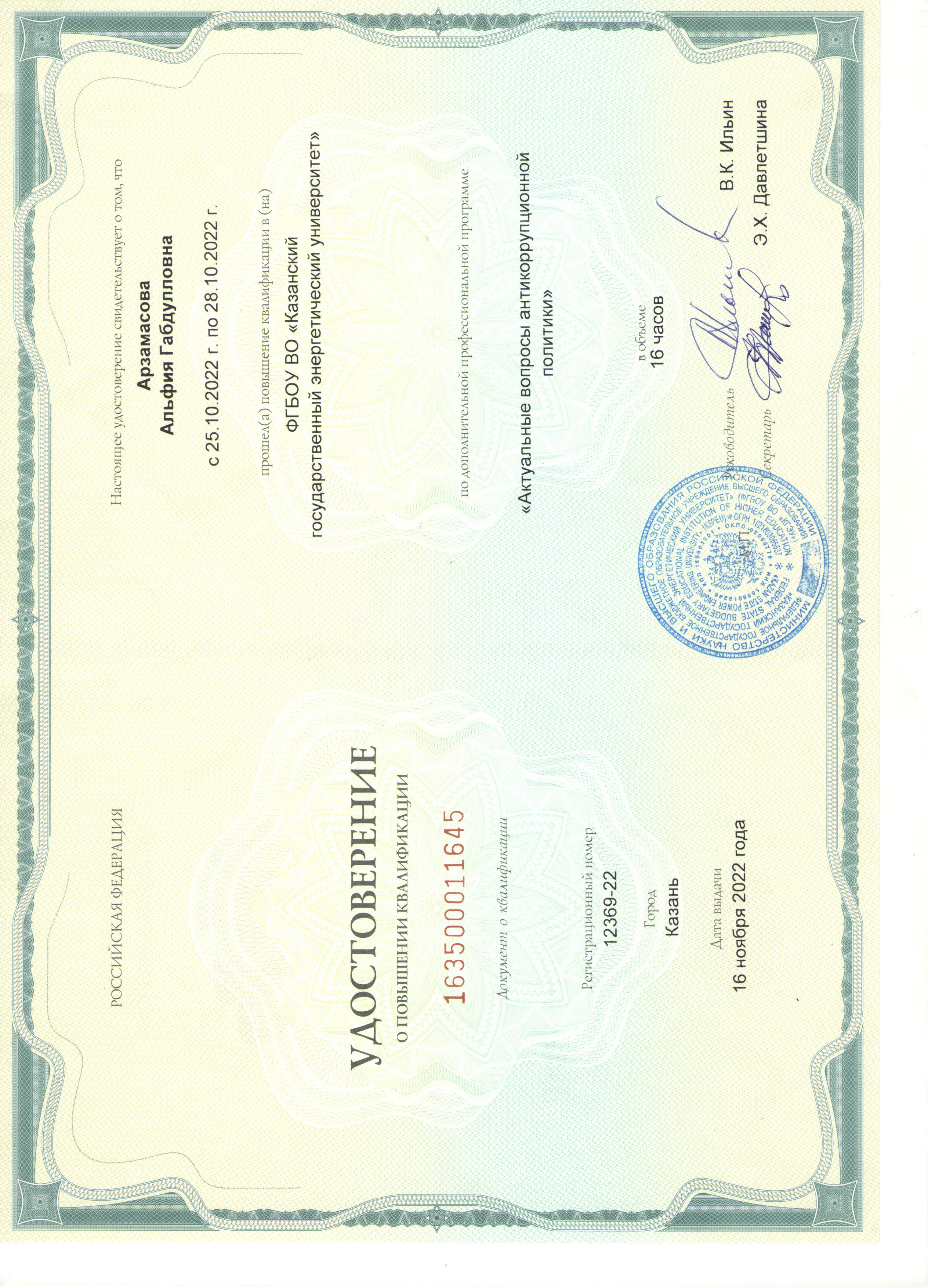 ФГБОУ ВО "КГЭУ" Актуальные вопросы антикоррупционнной политики 163500011645 16.11.2022 16