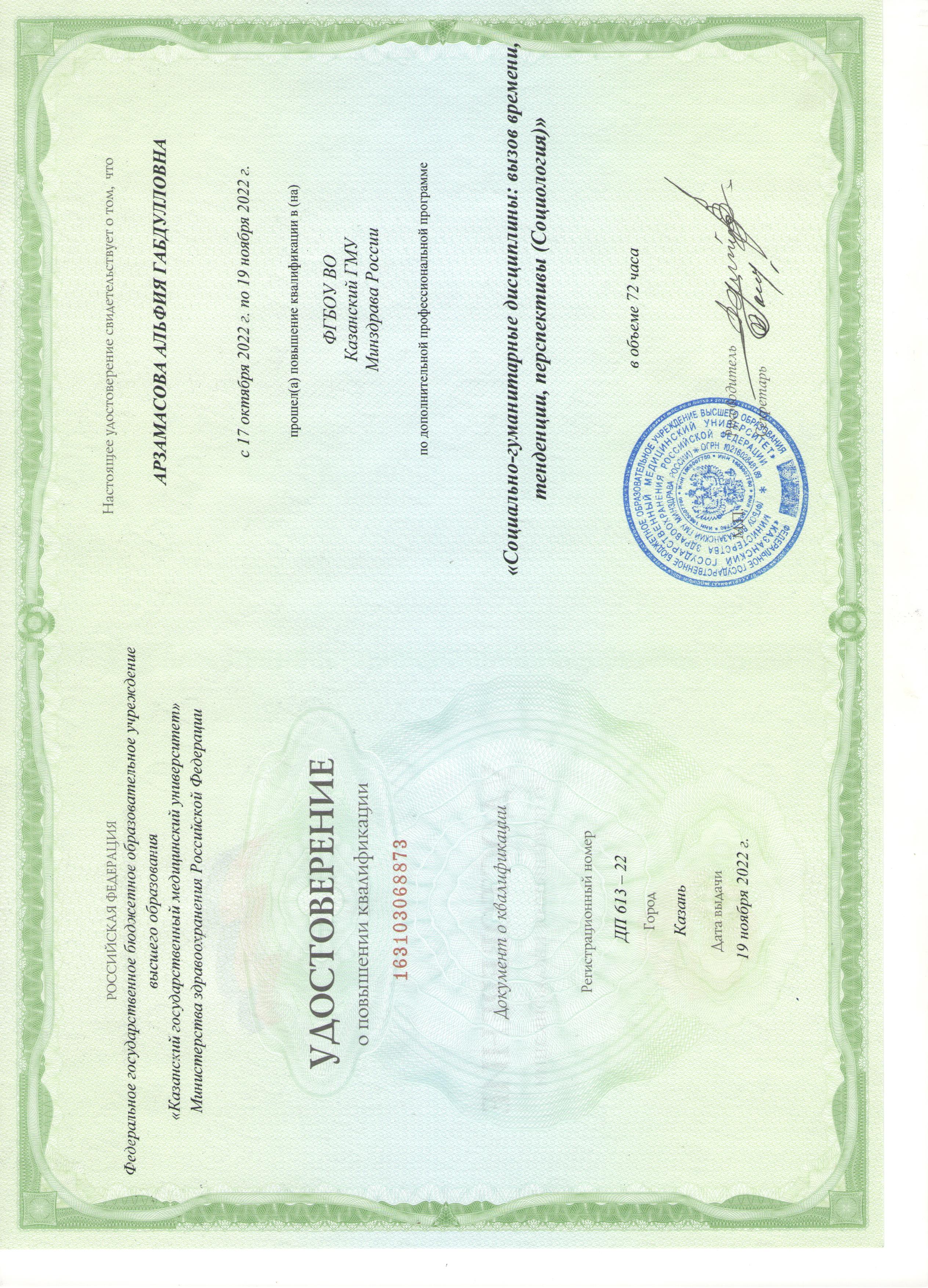 ФГБОУ ВО Казанский ГМУ Минздрава России Социально-гуманитарные дисциплины: вызов времени, тенденции, перспективы (Социология) 163103068873 19.11.2022 72