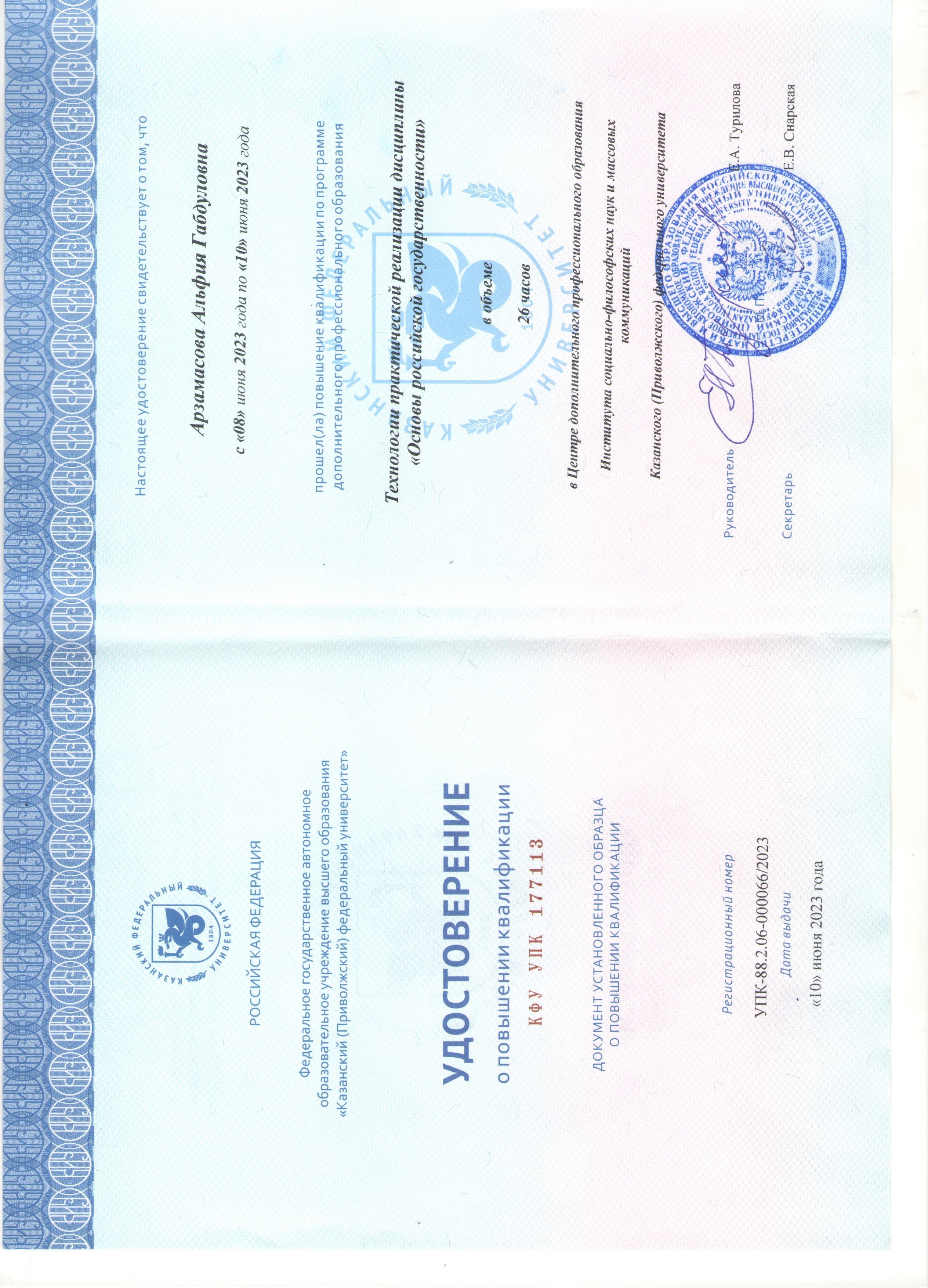ФГАОУ ВО "Казанский федеральный университет" Технология практической реализации дисциплины "Основы российской государственности" 177113 10.06.2023 26