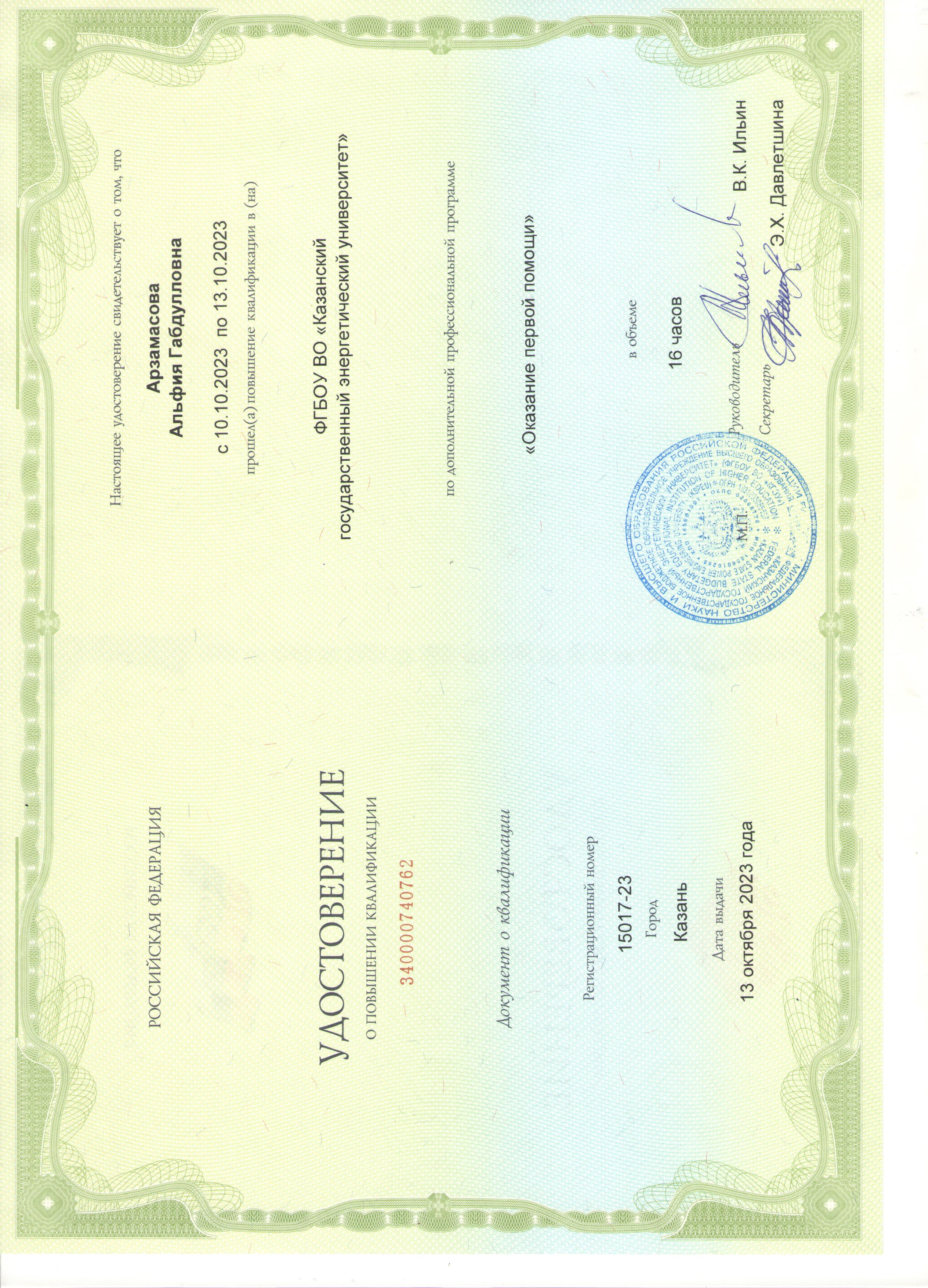 ФГБОУ ВО "КГЭУ" Оказание первой помощи 340000740762 13.10.2023 16