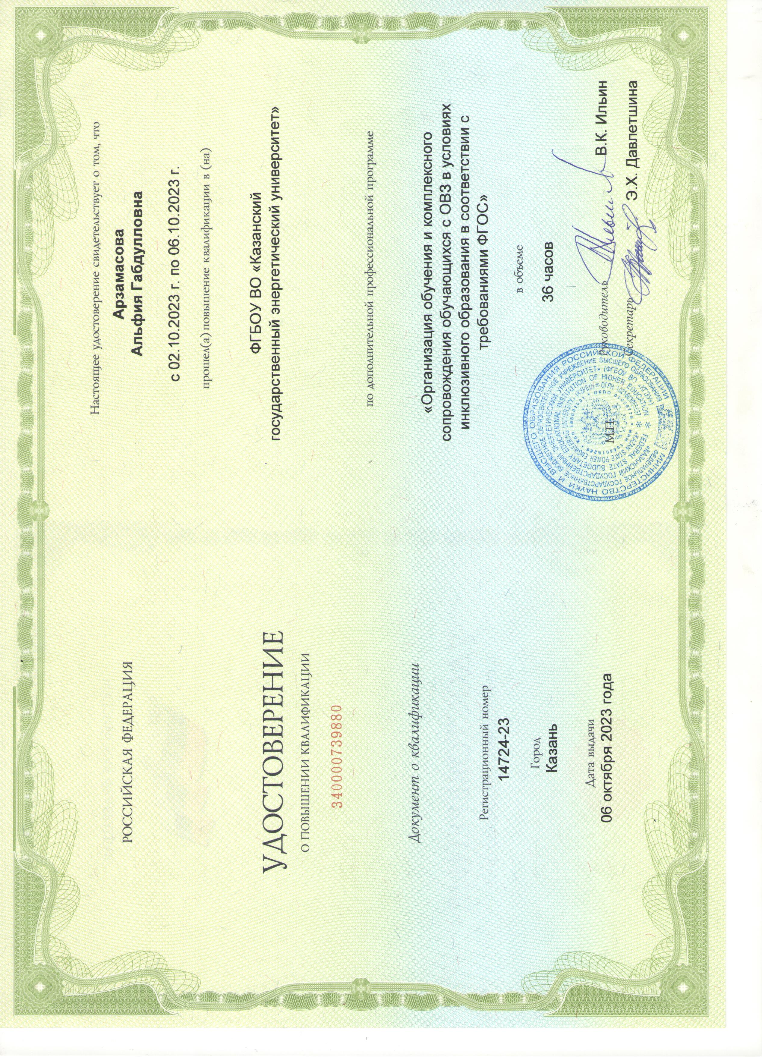 ФГБОУ ВО "КГЭУ" Организация обучения и комплексного сопровождения обучающихся с ОВЗ в условиях инклюзивного образования в соответствии с требованиями ФГОС 340000739880 06.10.2023 36