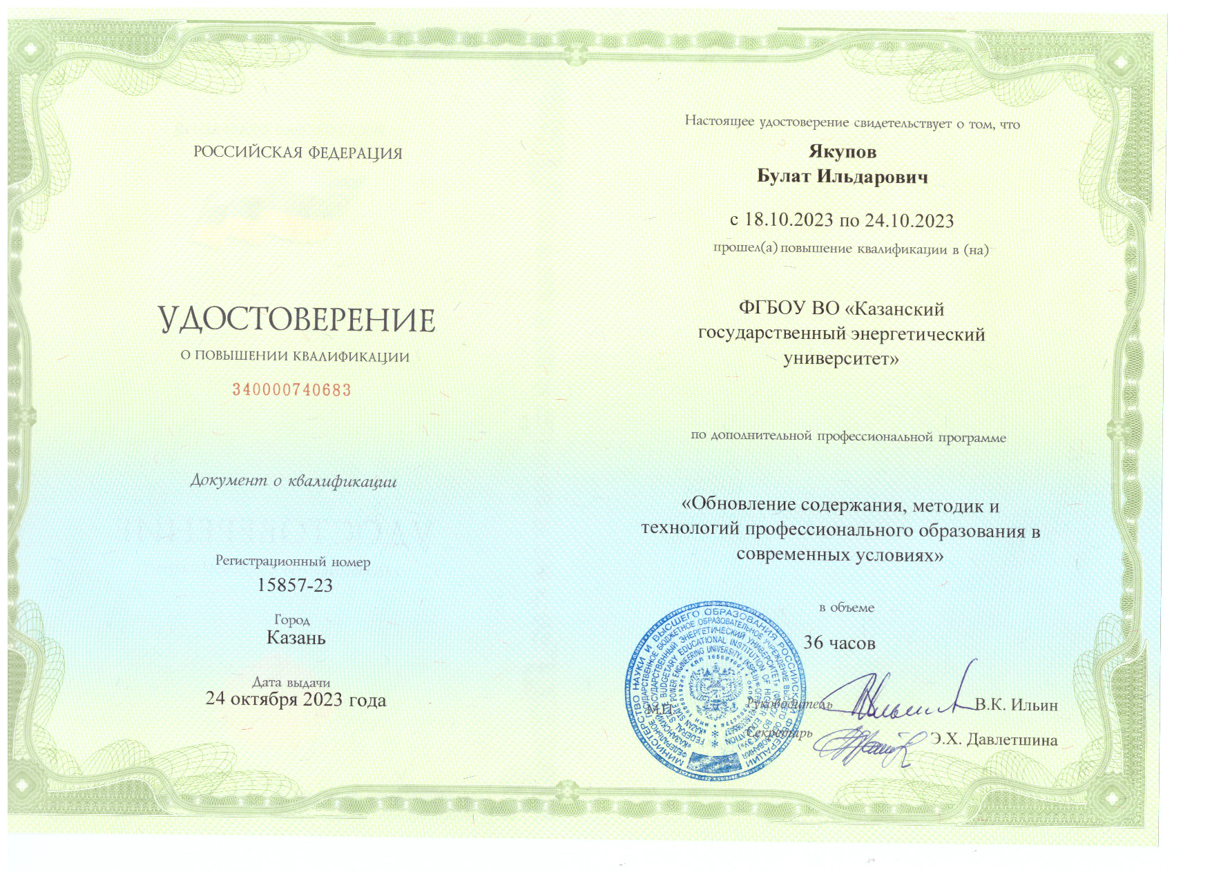 ФГБОУ ВО "Казанский государственный энергетический университет" Обновление содержания, методик и технологий профессионального образования в современных условиях 340000740683 15857-23 24.10.2023 36