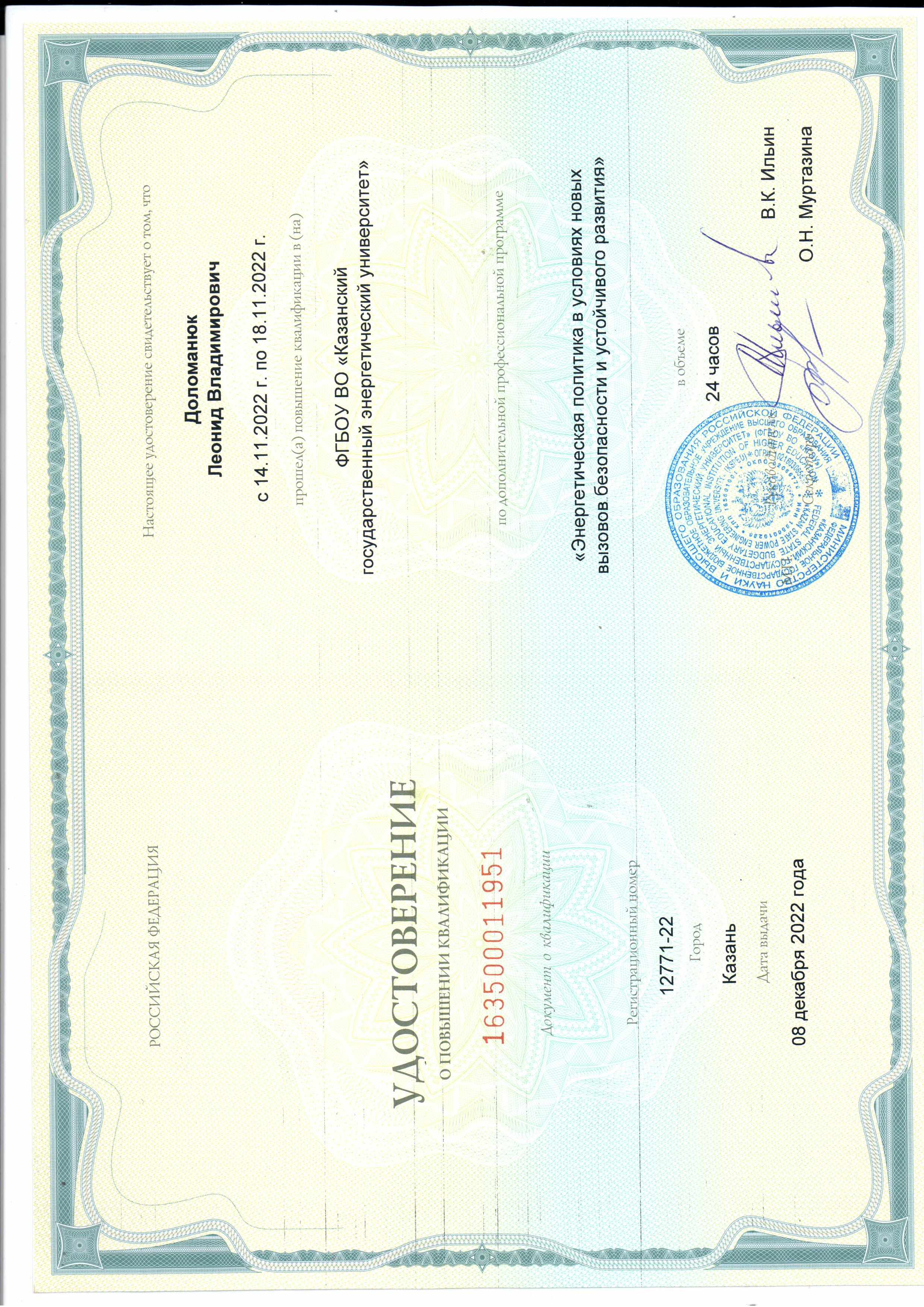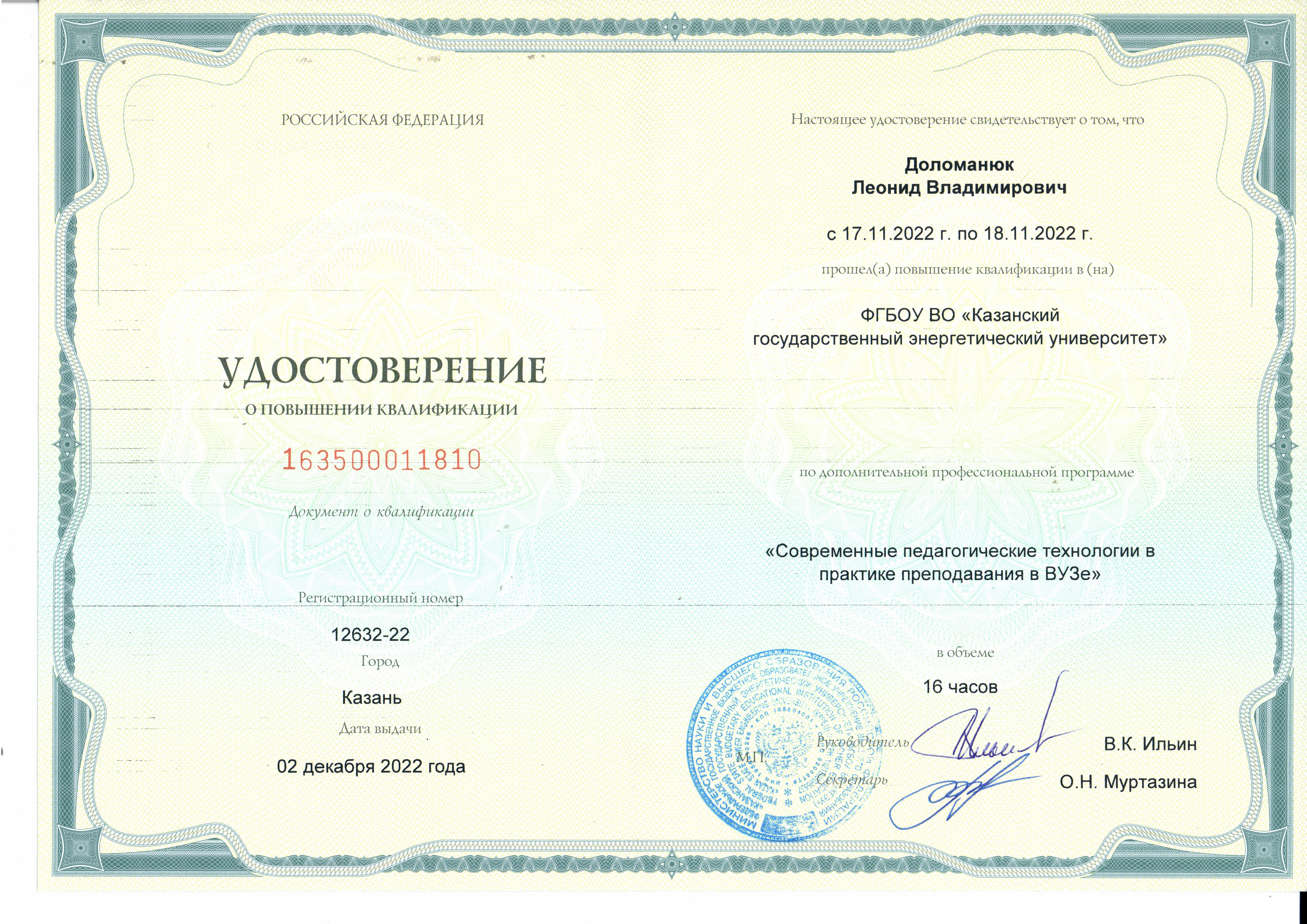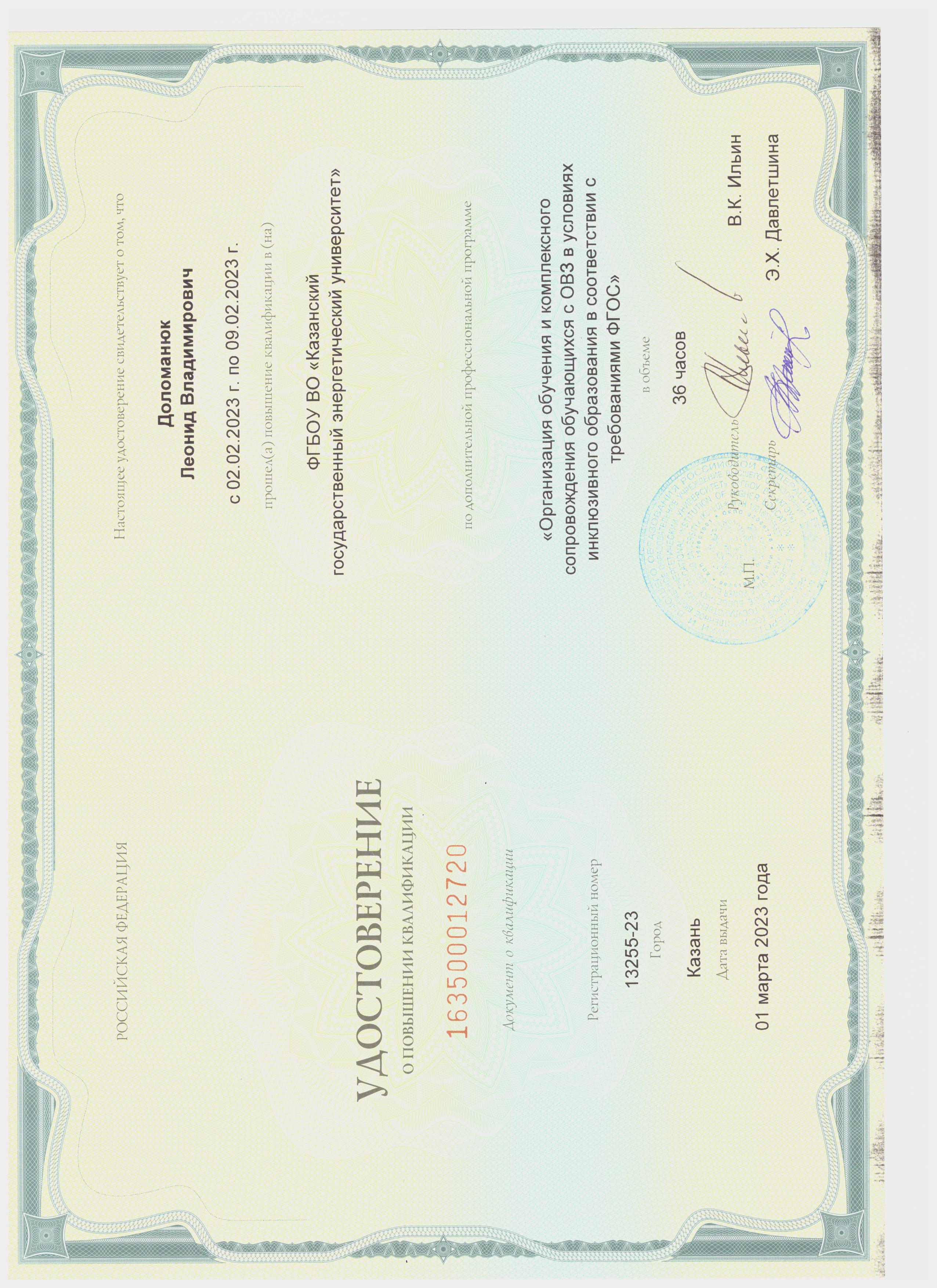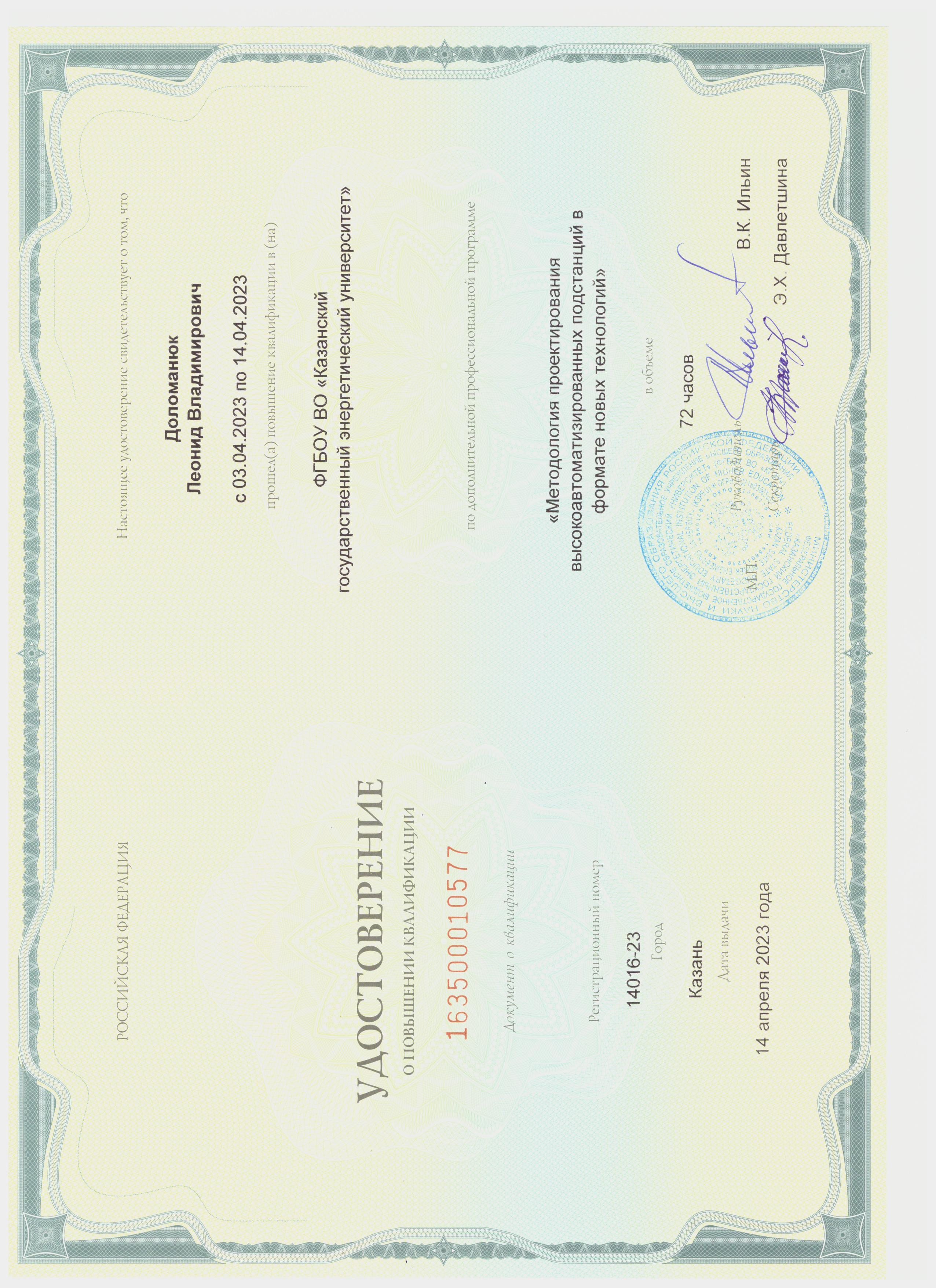 В 2001- 2003 гг. прошел профессиональную переподготовку в Центре подготовки и повышения квалификации преподавателей вузов КГТУ (КХТИ) - преподаватель высшей школы.