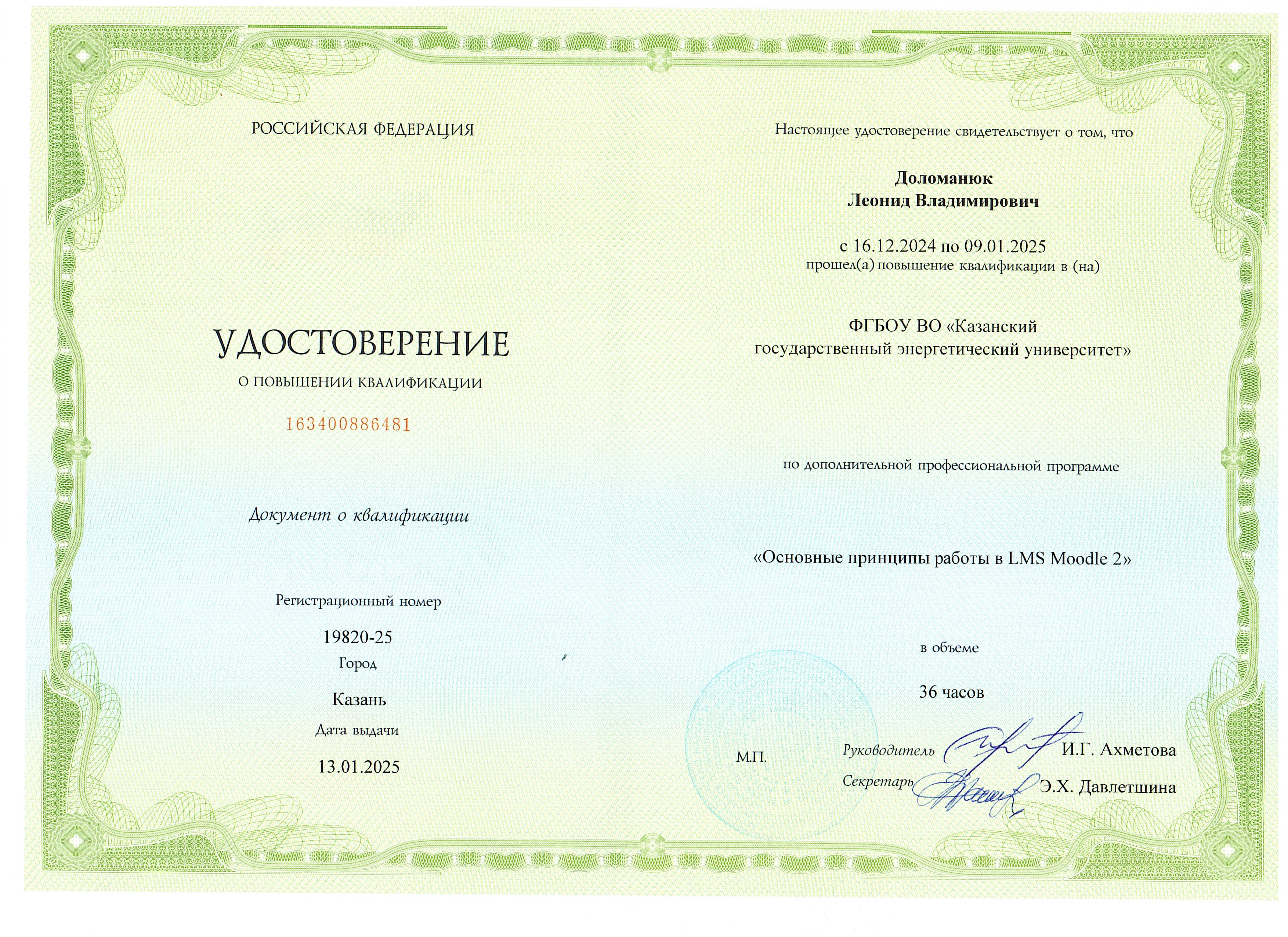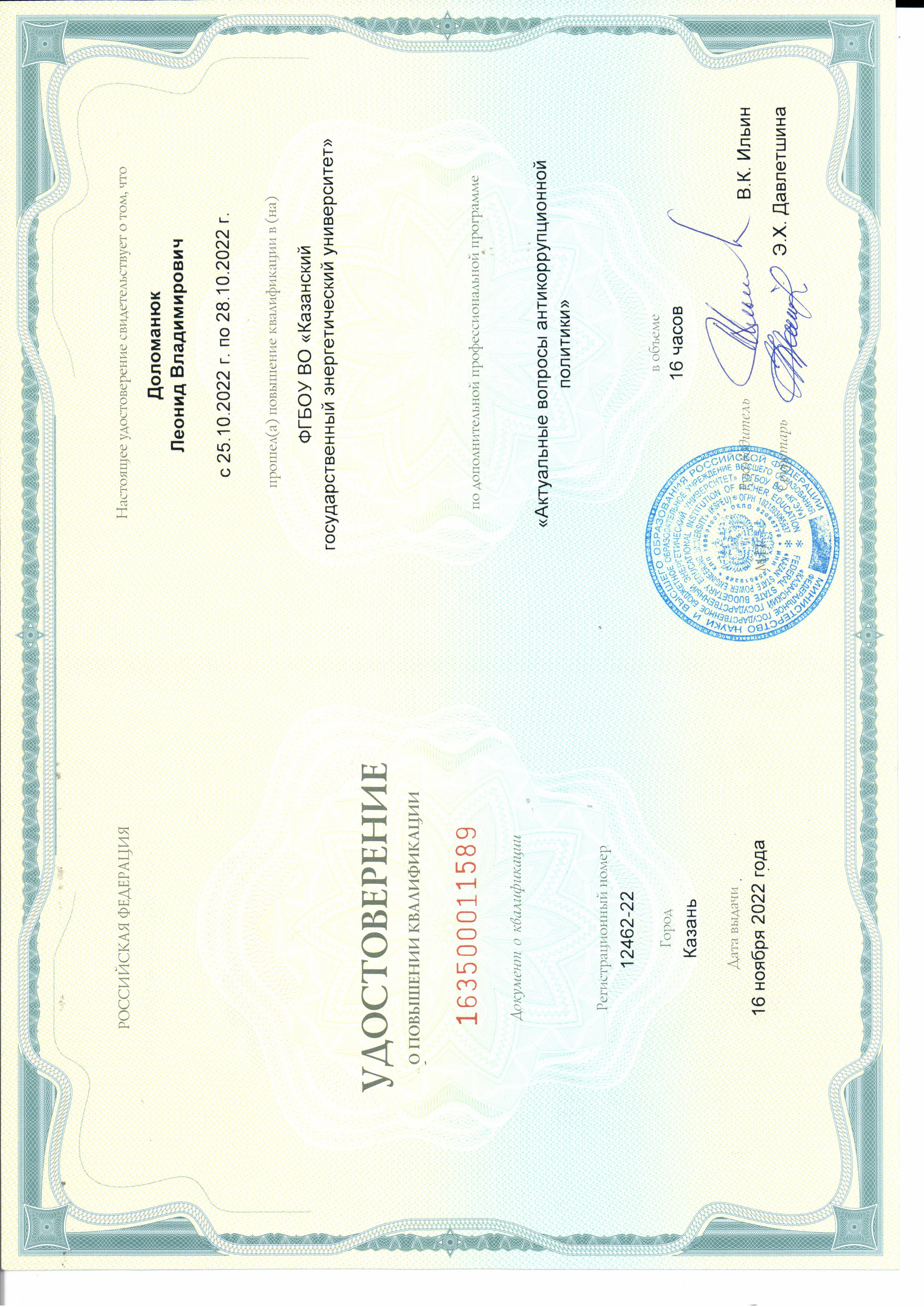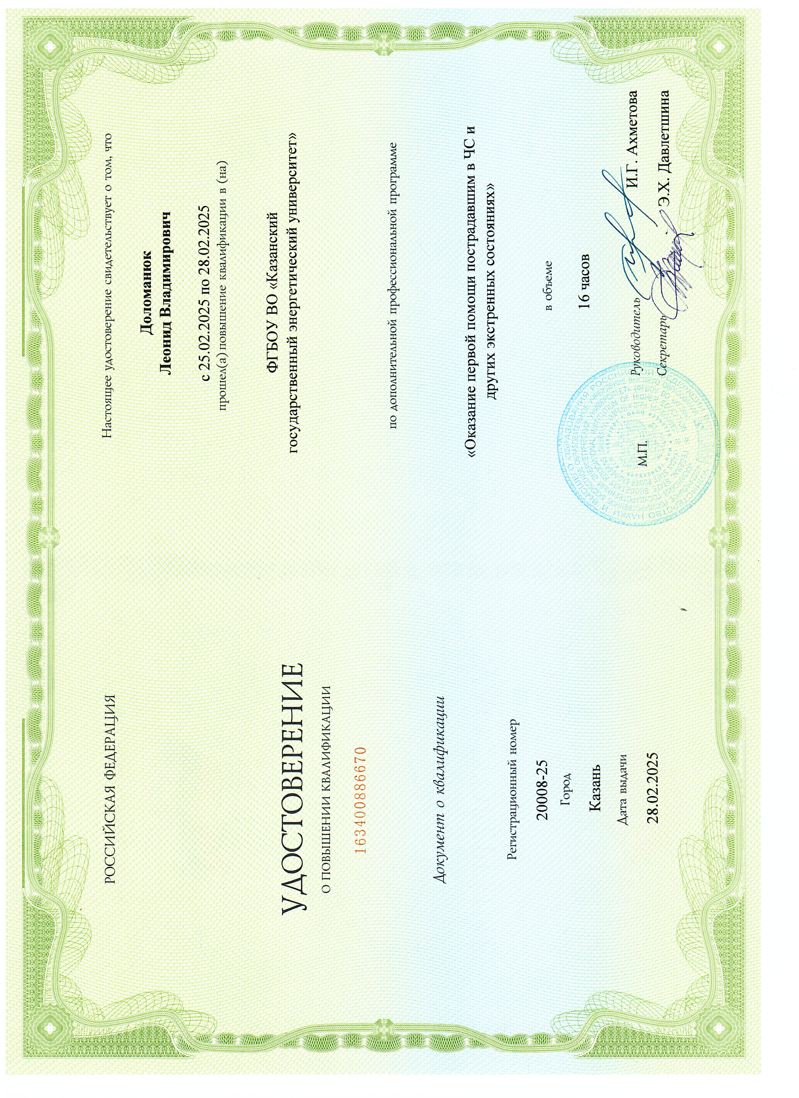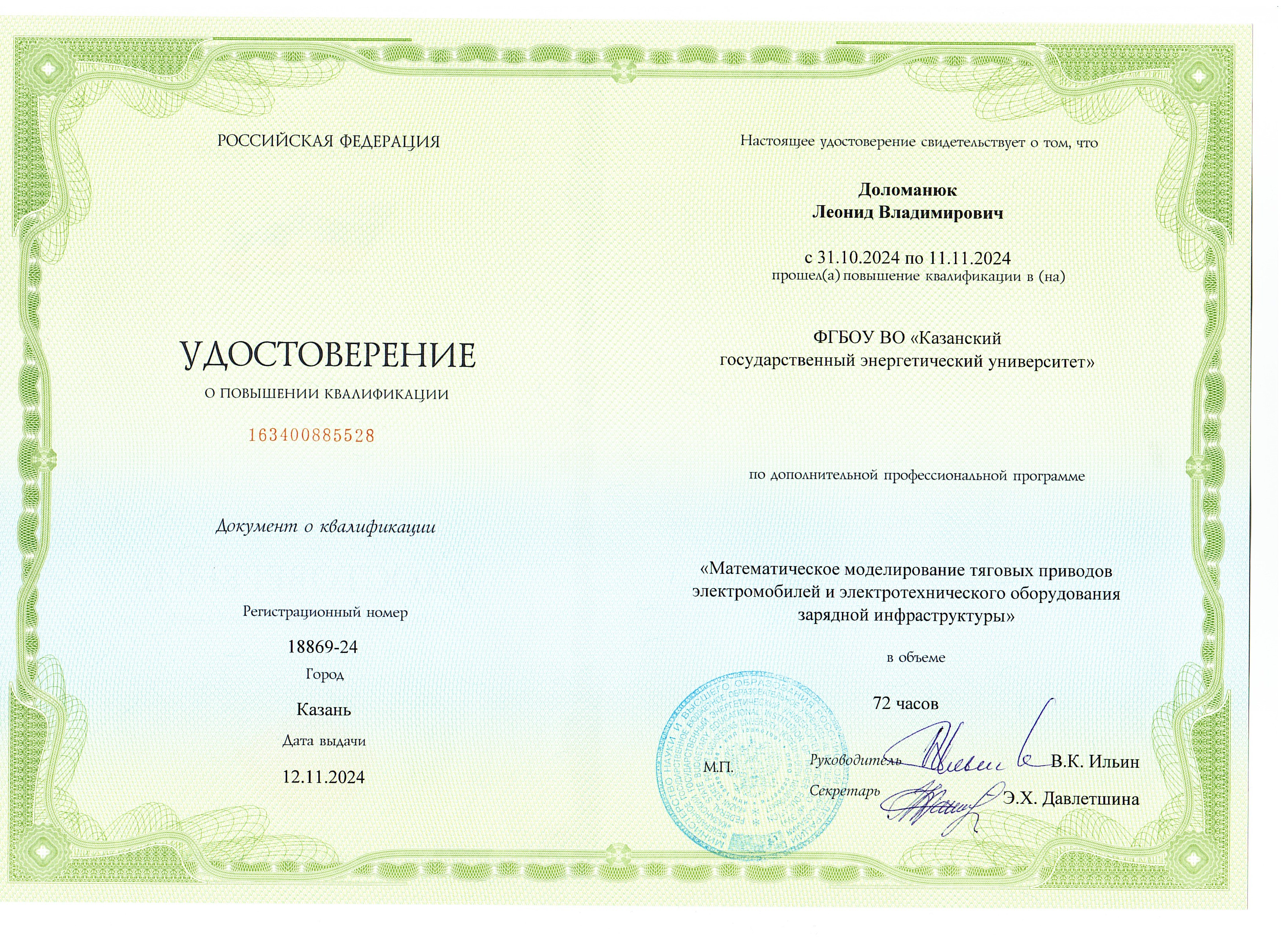В 2001- 2003 гг. прошел профессиональную переподготовку в Центре подготовки и повышения квалификации преподавателей вузов КГТУ (КХТИ) - преподаватель высшей школы.
