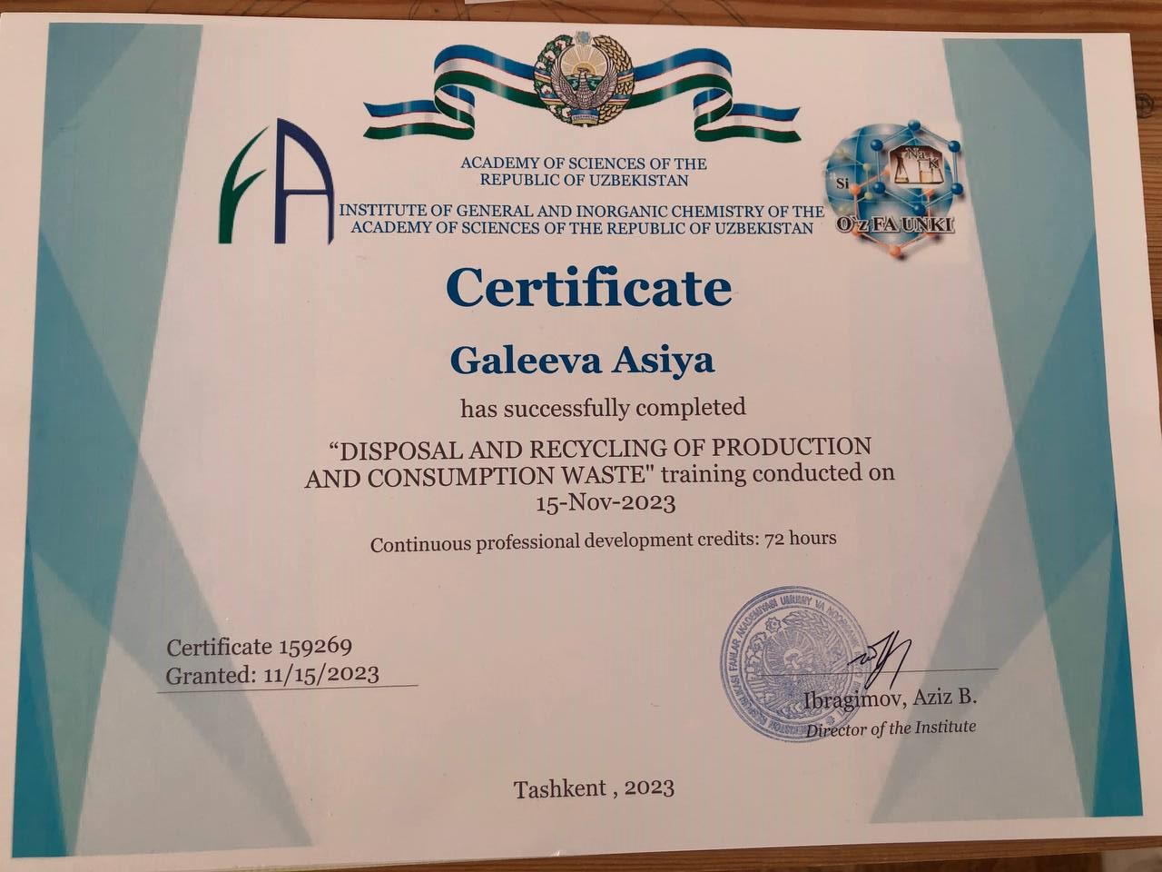 Академия наук Узбекистана Международная программа "Disposal and recycling of production and consumption waste". 159269 15.11.2023 72