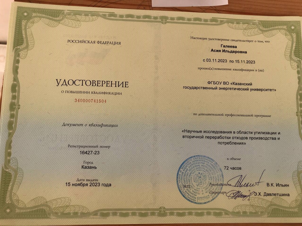 ФГБОУ ВО "Казанский государственный энергетический университет" Научные исследования в области утилизации и вторичной переработки отходов производства и потребления 340000741504 15.11.2023 72