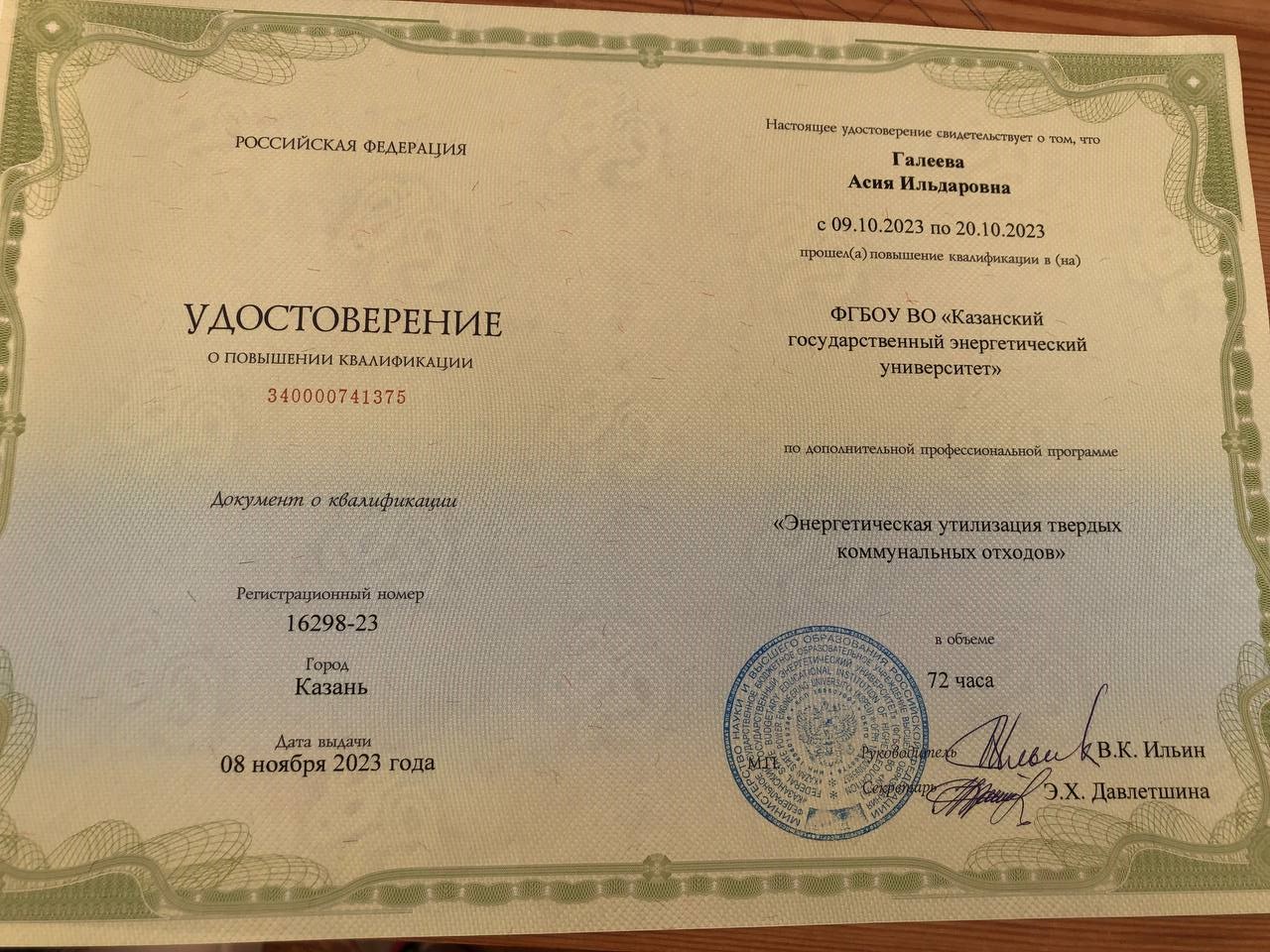 ФГБОУ ВО "Казанский государственный энергетический университет" Энергетическая утилизация твердых коммунальных отходов 340000741375 08.11.2023 72