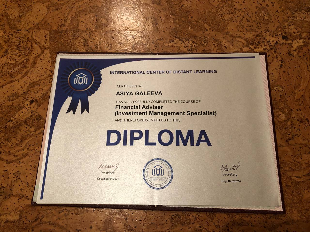 International Center of Distant Learning Diploma of Financial Adviser (Investment Management Specialist) 023714 09.12.2021