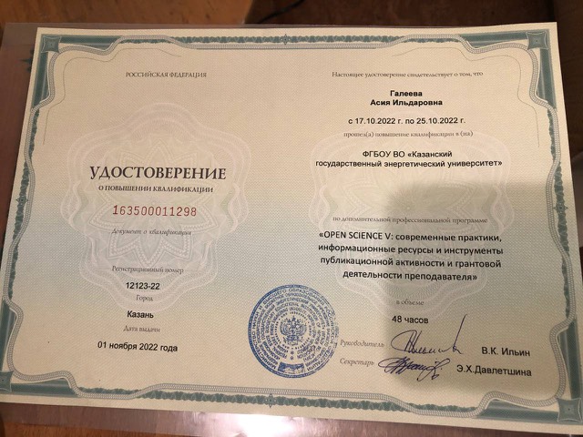 ФГБОУ ВО "Казанский государственный энергетический университет" Open Science V: современные практики, информационные ресурсы и инструменты публикационной активности и грантовой деятельности преподавателя 163500011298 01.11.2022 48