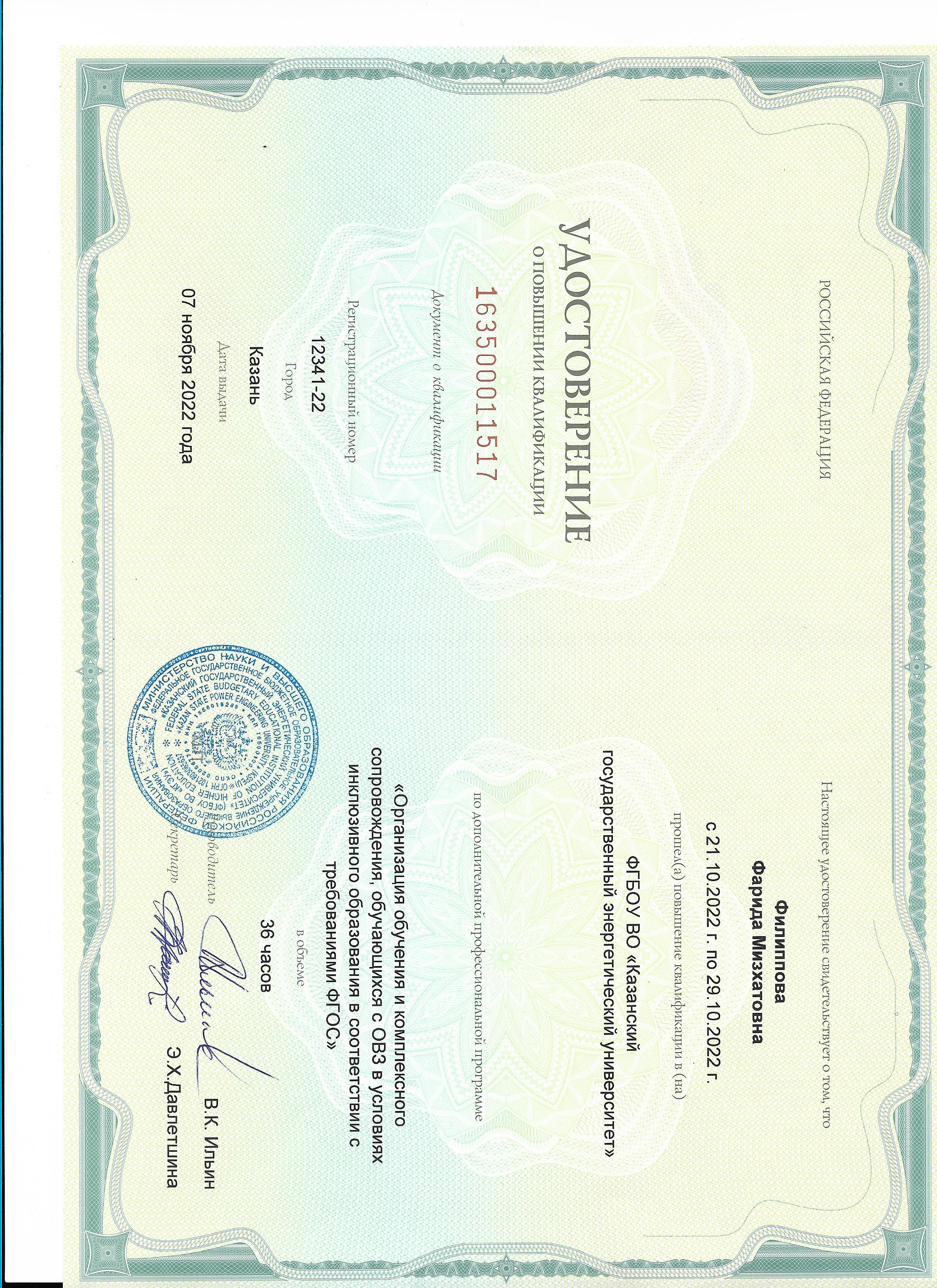 ФГБОУ ВО "Казанский государственный энергетический университет" "Организация обучения и комплексного сопровождения, обучающихся с ОВЗ в условиях инклюзивного образования в соответствии с требованиями ФГОС" 163500011517 07.11.2022 36