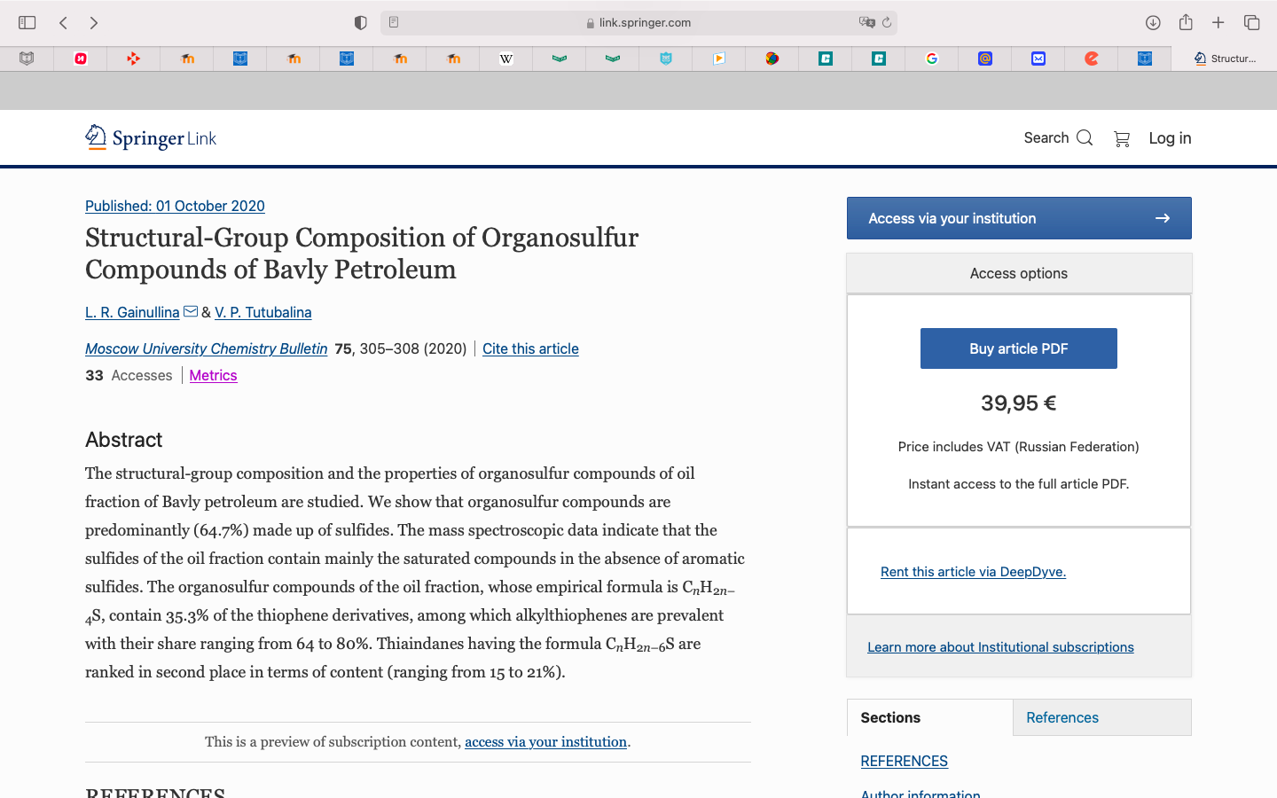 Structural-group composition of organosulfur compounds of Bavly petroleum / Moscow University Chemistry Bulletin, 75, 305-308 (2020) (Scopus) |