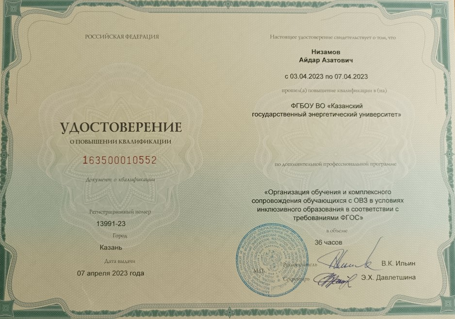 ФГБОУ ВО "Казанский государственный энергетический университет" Программа повышения квалификации "Организация обучения и комплексного сопровождения обучающихся с ОВЗ в условиях инклюзивного образования в соответствии с требованиями ФГОС" 163500010552 30.08.2023 36