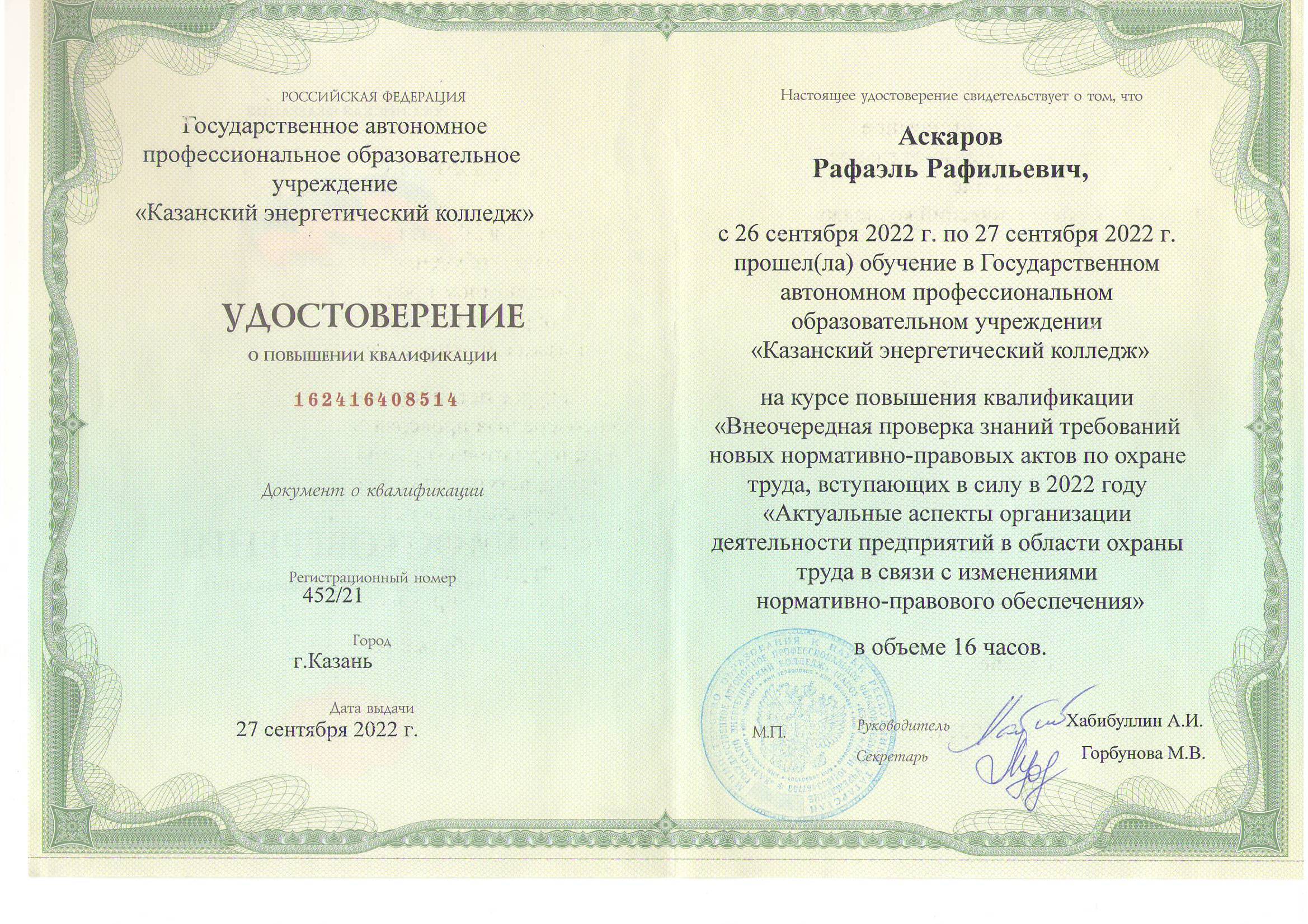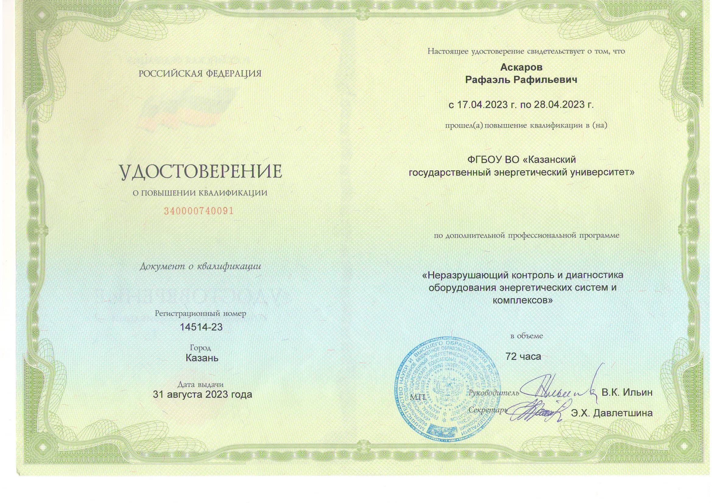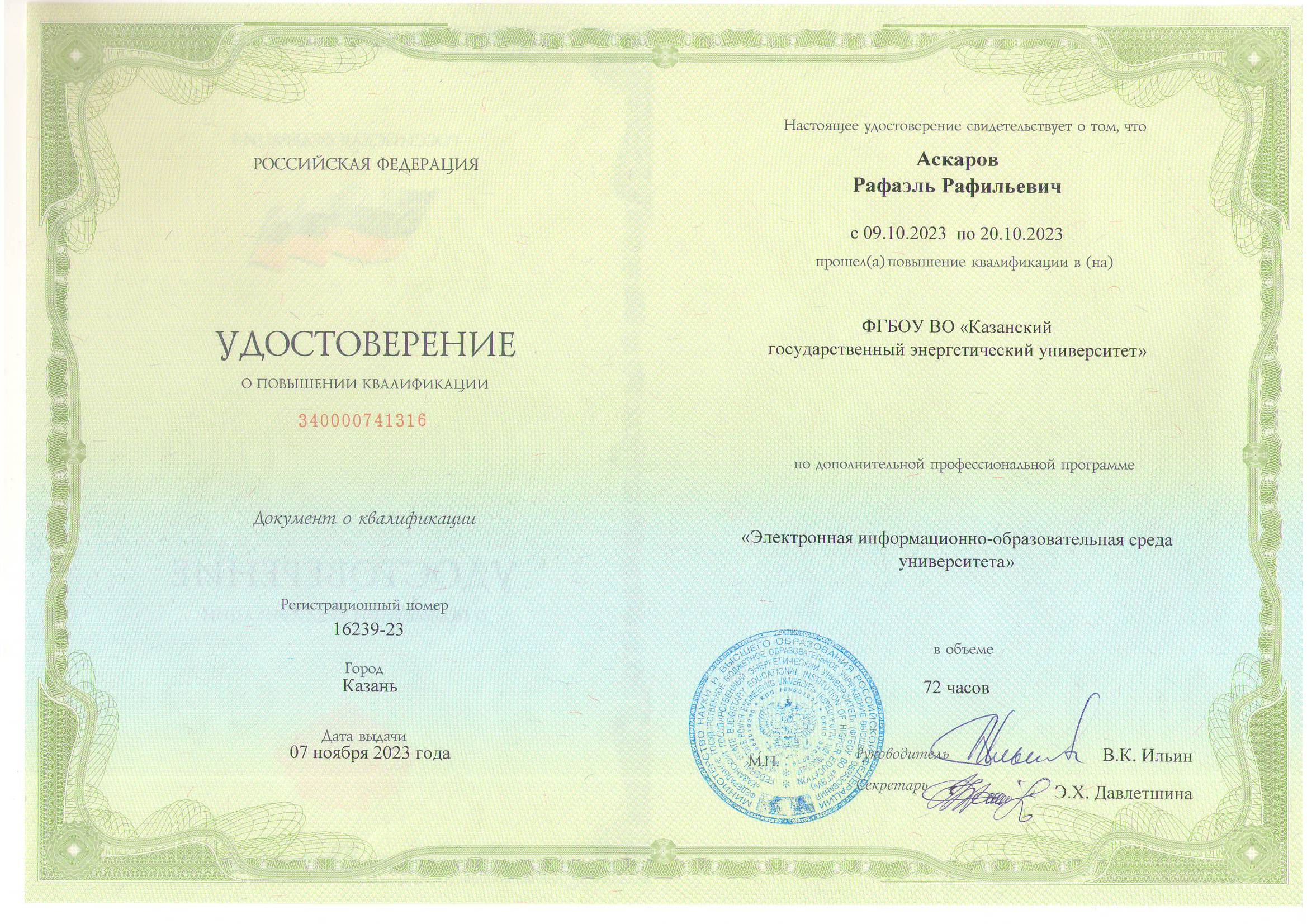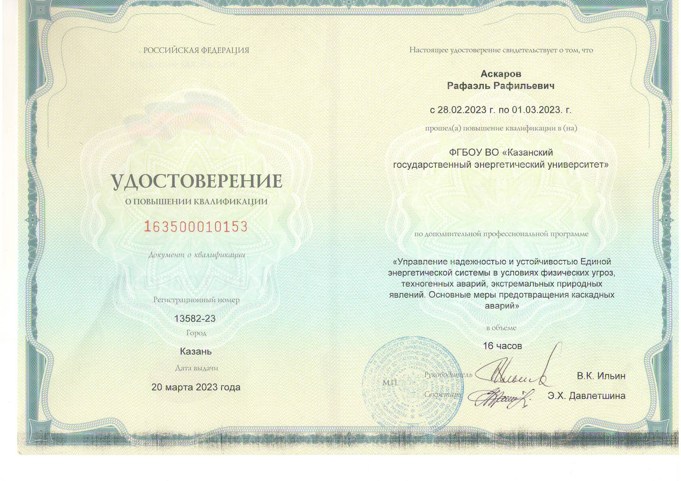 В настоящее время доцент Аскаров Р.Р. ведет научное руководство по темам кандидатских диссертаций аспирантки очной формы обучения Закировой А.Б. и соискателя Гимадиева Р.А.