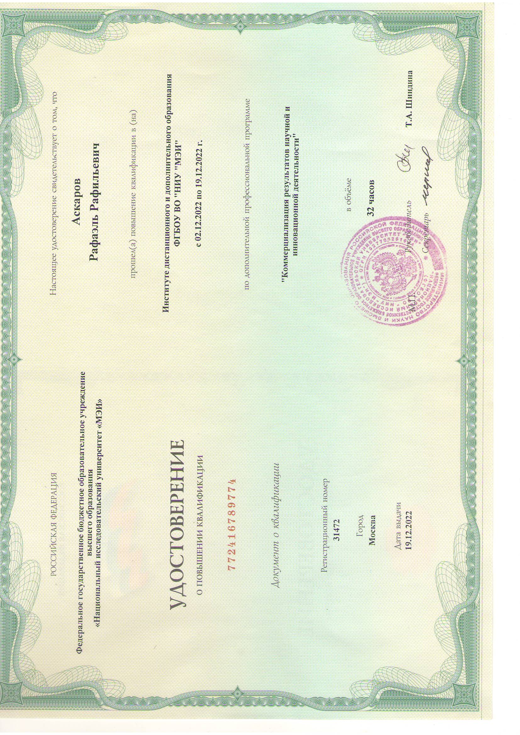 Имея знания и образование по вопросам инновационного предпринимательства, полученные в рамках курсов повышения квалификации «ЦНТИ-Прогресс» (С.-Петербург), IC2 CRDF Global (Остин, Техас) и казанских семинаров Аскаров Р.Р. проводит экспертизу по конкурсам научно-инновационных проектов, в т.ч. по программе УМНИК, решением аттестационной комиссии МОН РФ (ФГБНУ НИИ РИНКЦЭ) от 25 октября 2012 года входит в Федеральный реестр экспертов научно-технической сферы.