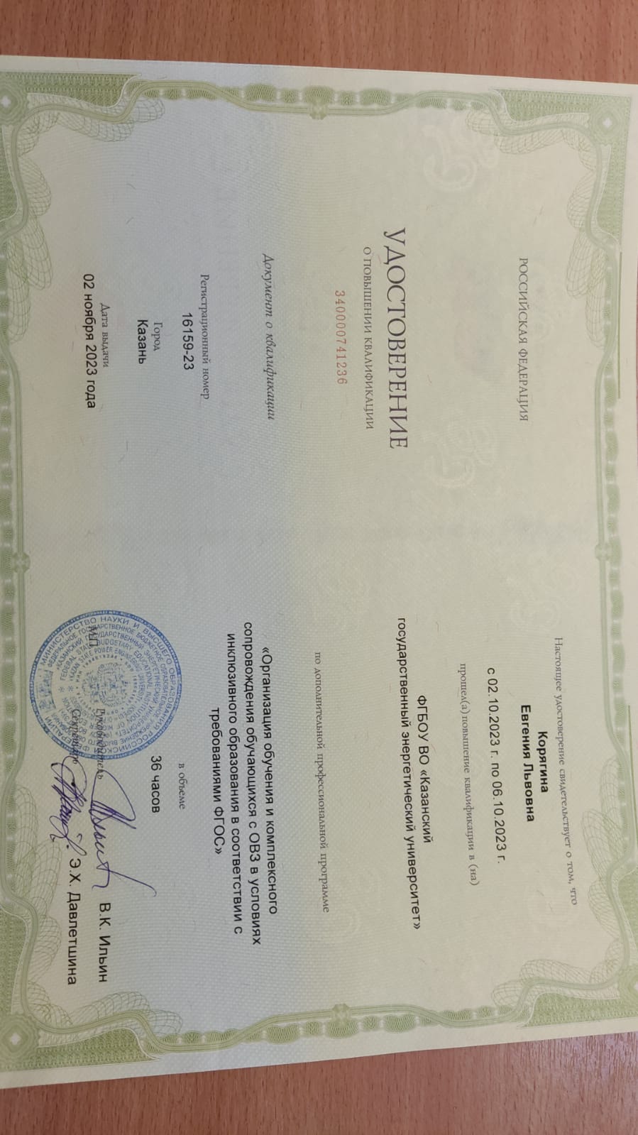 Повышение квалификации "Организация обучения и комплексного сопровождения обучающихся с ОВЗ в условиях инклюзивного образования в соответствии с требованиями ФГОС" |