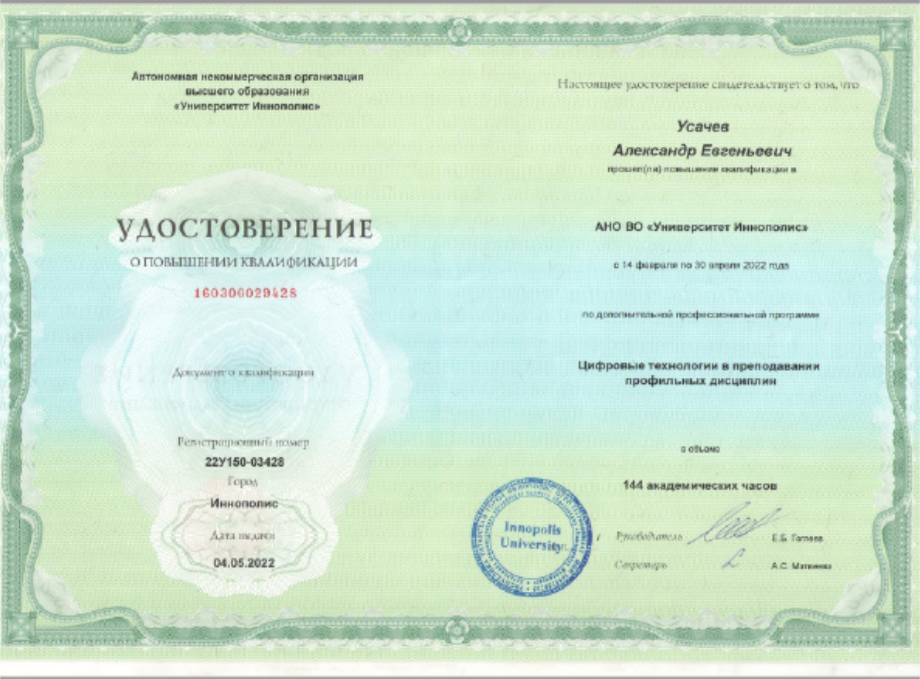 АНО ВО "Университет-Иннополис" Цифровые технологии в преподавании профильных дисциплин 1603000029428 22У150-03428 04.05.2022 144