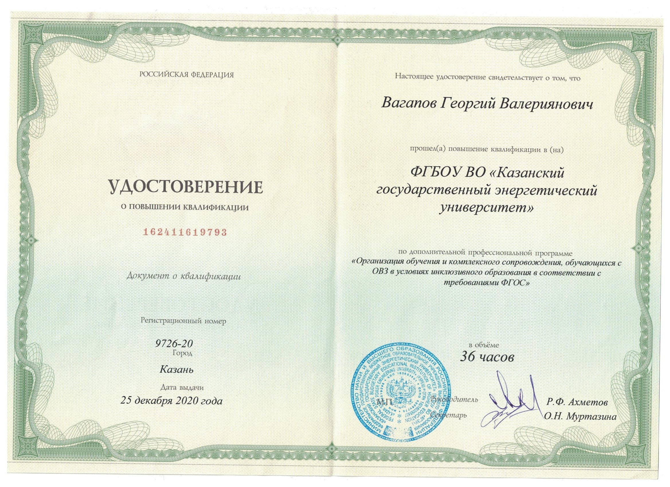 ФГБОУ ВО "Казанский государственный энергетический университет" Организация обучения и комплексного сопровождения, обучающихся с ОВЗ в условиях инклюзивного образования в соответствии с требованиями ФГОС 9726-20 23.11.2020 36