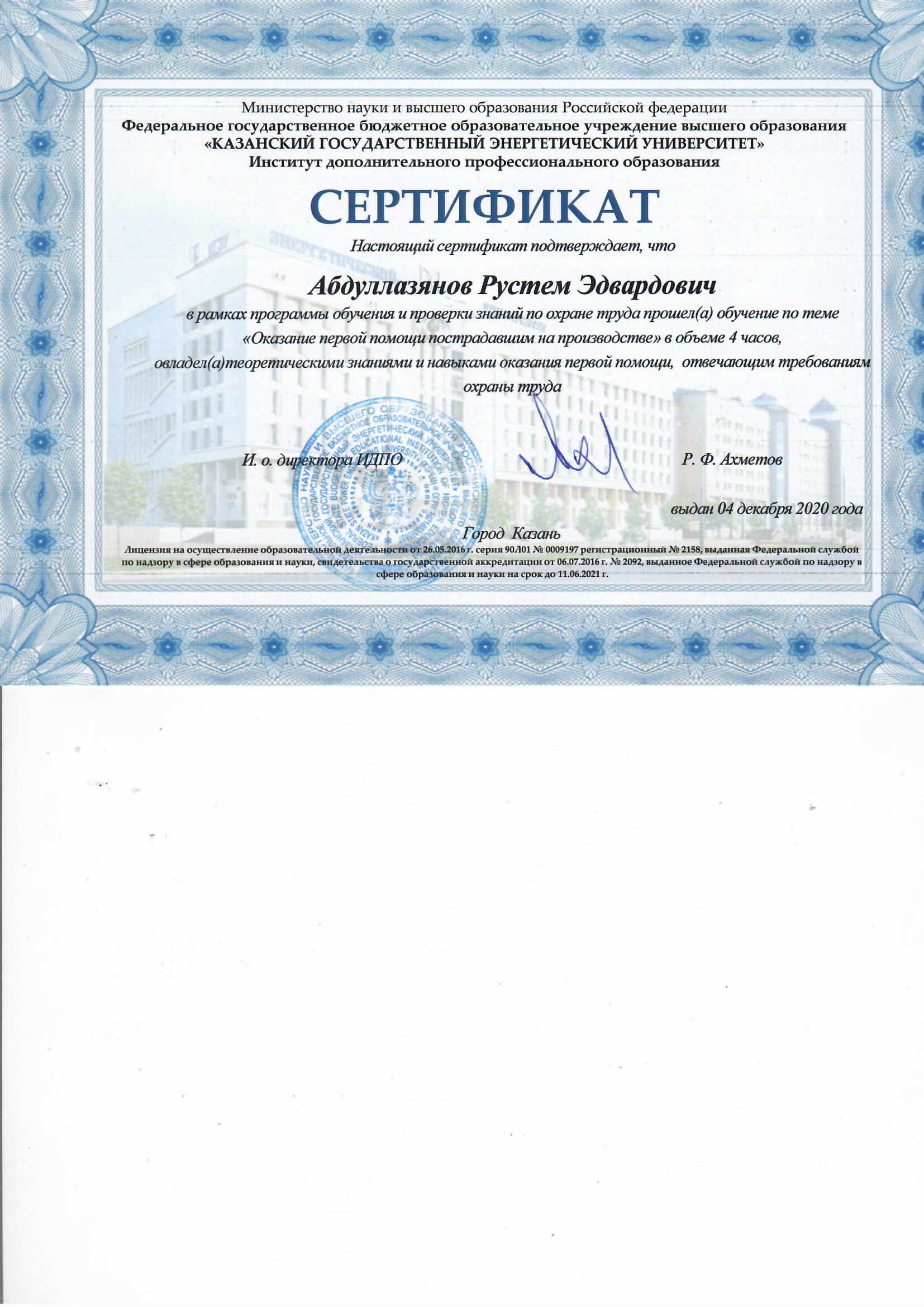 ФГБОУ ВО "КГЭУ" Оказание первой помощи пострадавшим на производстве СЕРТИФИКАТ 04.12.2020 4