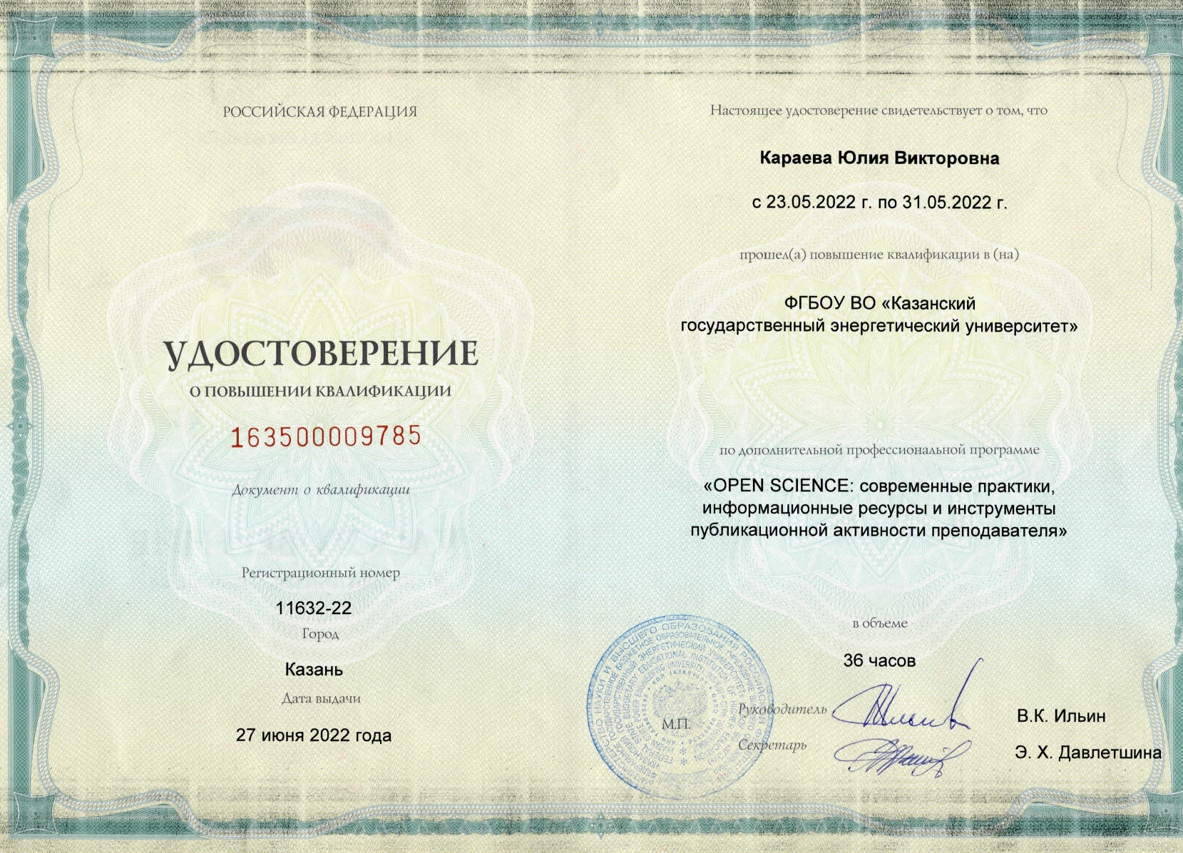 ФГБОУ ВО «Казанский государственный энергетический университет» OPEN SCIENCE: современные практики, информационные ресурсы и инструменты публикационной активности преподавателя 163500009785 27.06.2022 36