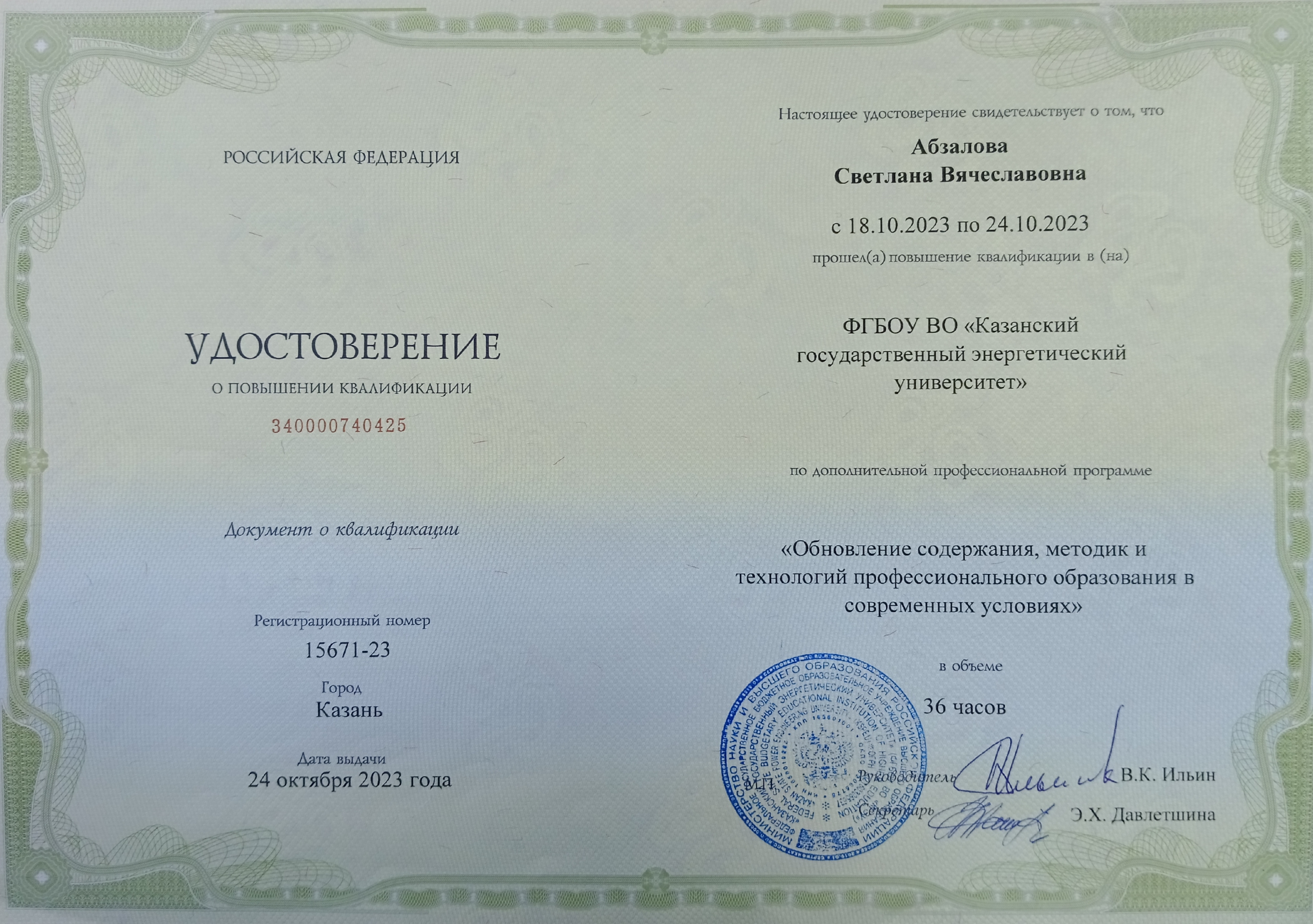 ФГБОУ ВО "Казанский государственный энергетический университет" Обновление содержания, методик и технологий профессионального образования в современных условиях 15671-23 24.10.2023 36